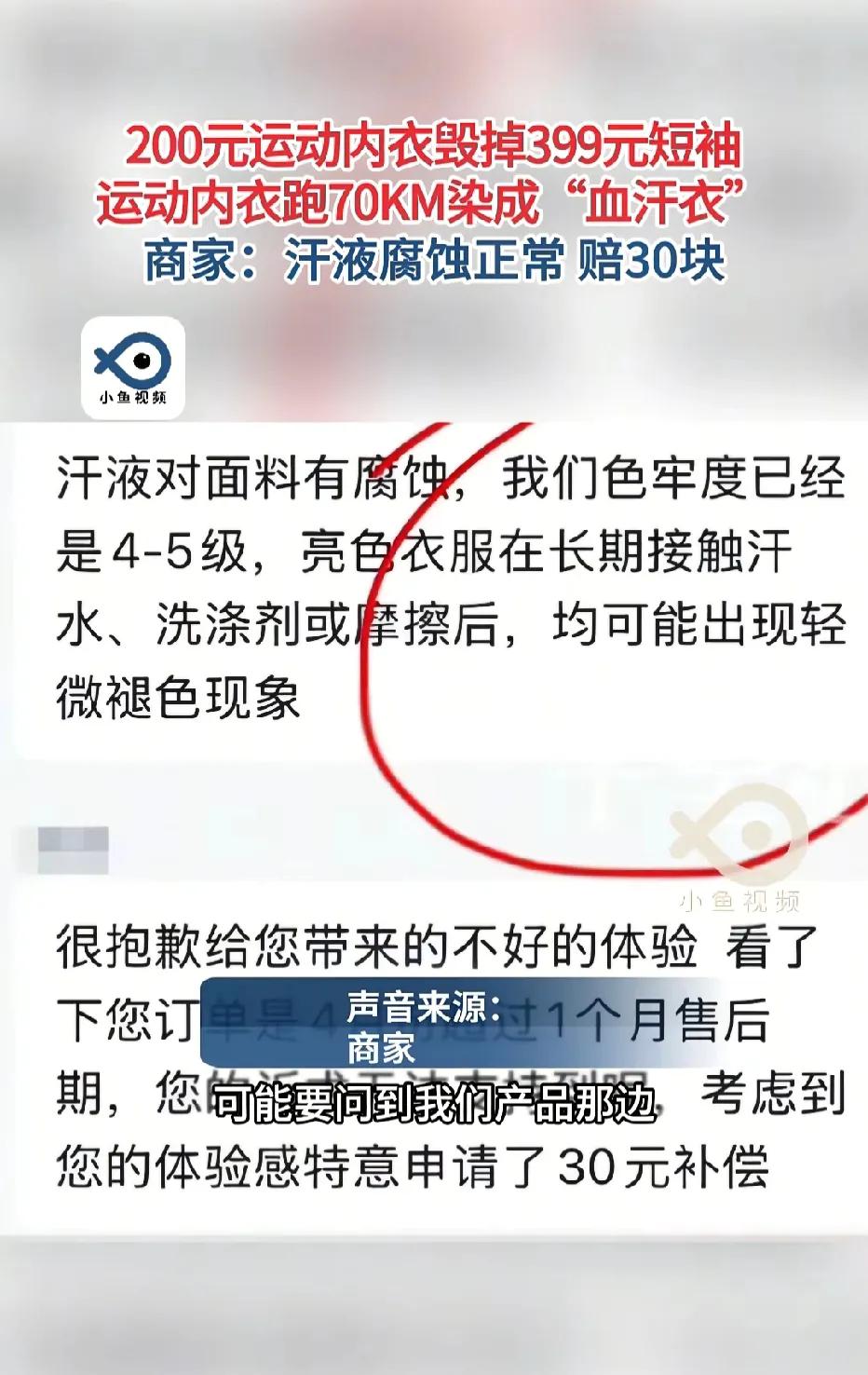 杭州,女子为参加越野赛,赛前买了件内衣,谁料比赛中途大汗淋漓,内衣居然褪色,将399元短袖胸部染成粉色,皮肤也被染了。她找商家投诉,商家却称“汗液腐蚀面料”,只赔30元。女子发现商品详情页从未标注汗液会导致褪色,此前还承诺过赔偿短袖,如今却拒不兑现,女子气不过,将继续维权。 据悉,女子是资深越野跑爱好者,准备参加一场70公里越野赛。 她特意花了239元买一件某品牌运动内衣,赛前她按照惯例多次清洗,内衣既没掉色也没变形,手感和透气性都让她满意。 她心想,自己穿专业的运动内衣跑步,肯定有胜算。 比赛当天,女子顶着烈日跑了整整17个小时,高强度运动让她大汗淋漓,贴身的运动内衣始终被汗水浸透。 冲过终点抵达酒店后,她发现很多人对她指指点点。 她低头看着衣服就傻了眼:内衣竟出现严重褪色。 她身上价值399元的短袖胸口位置染成了大片粉色,洗了三次都没洗掉,成了彻底的废品。 更让她糟心的是,皮肤也没能幸免,胸口、腋下等贴身部位沾满了粉色印记,用沐浴露反复揉搓都难以清洁。 后续还出现了干涩发痒的不适,怀疑是染料刺激引发的皮肤敏感。 女子第一时间联系商家维权,提出退货退款,并要求赔偿被染色的短袖。 可因为内衣已过平台售后期,系统未能直接受理。 商家看到留言后给出的回应更让她气愤:这是汗液腐蚀面料导致的掉色,跟产品质量无关,只愿意赔偿30元作为补偿。 女子翻遍购买页面,确实没找到任何关于汗液可能导致褪色的提示,甚至商家还强调“流汗不闷汗”。 所以,女子对商家的离谱说法坚决不接受。 11月1日,忍无可忍的女子在社交平台发帖避雷,详细讲述了自己的遭遇,还附上了染色的衣物、皮肤印记和沟通记录。 帖子很快引发关注,不少网友吐槽“第一次听说汗液能腐蚀衣服”“这是质量不达标还找借口”。 眼看舆论发酵,商家主动联系女子,态度来了个180度大转弯,承诺会全额赔偿她的399元短袖,让她先删除帖子。 可女子按要求删帖后,商家却没了下文,既没给出具体处理方案,也没转账赔偿。 她多次追问都被敷衍,甚至发现那款掉色的运动内衣仍在平台正常售卖,丝毫没有下架整改的意思。 女子又气又无奈,目前已整理好证据,包括购物凭证、染色实物、聊天记录、皮肤不适的就医记录等,明确表示会向消费者协会维权拿到应有的赔偿。 那么,从法律角度,该如何看待此事呢? 《消费者权益保护法》第24条规定:商品存在质量缺陷的,不受售后期限制,消费者有权要求退换货并赔偿损失。 女子购买的运动内衣在比赛中出现严重褪色,导致其短袖被染色,皮肤也出现不适症状,这表明内衣存在质量问题。 虽然内衣已过平台售后期,但商品存在质量缺陷并不受售后期限制,女子有权要求商家退货退款,并赔偿被染色的短袖。 《产品质量法》第26条规定:产品质量应当符合“不存在危及人身、财产安全的不合理的危险”以及“具备产品应当具备的使用性能,但是,对产品存在使用性能的瑕疵作出说明的除外”等要求。 该内衣在正常使用情况下,因汗液就出现严重褪色并损害消费者健康和财产安全,显然不符合产品质量要求,商家应当承担相应的责任。 商家为平息舆论作出全额赔偿短袖的承诺,属于单方面加重自身义务的真实意思表示。 若商家承诺赔偿后拒不兑现,可构成欺诈,女子可维权。 对此,你怎么看?