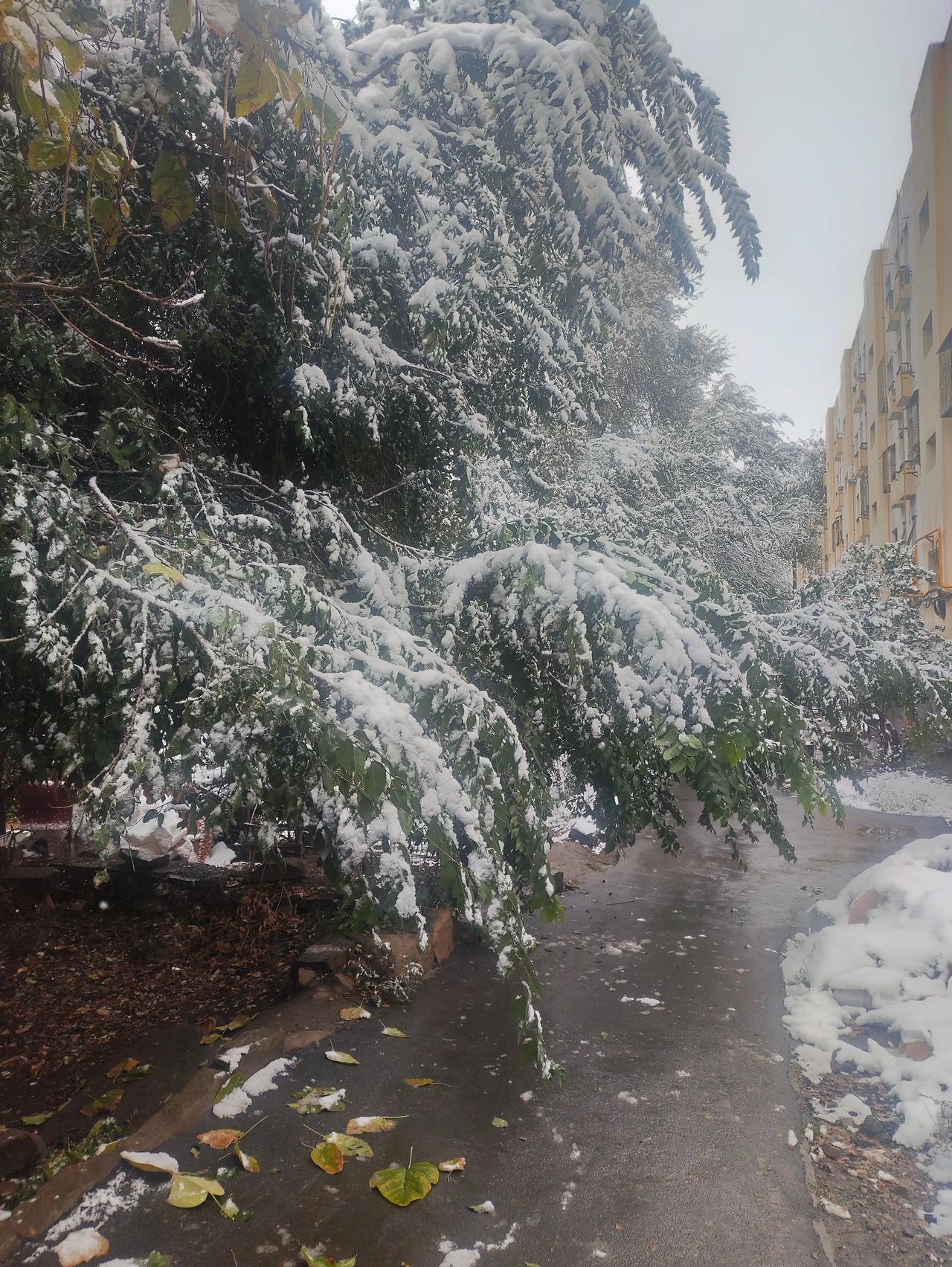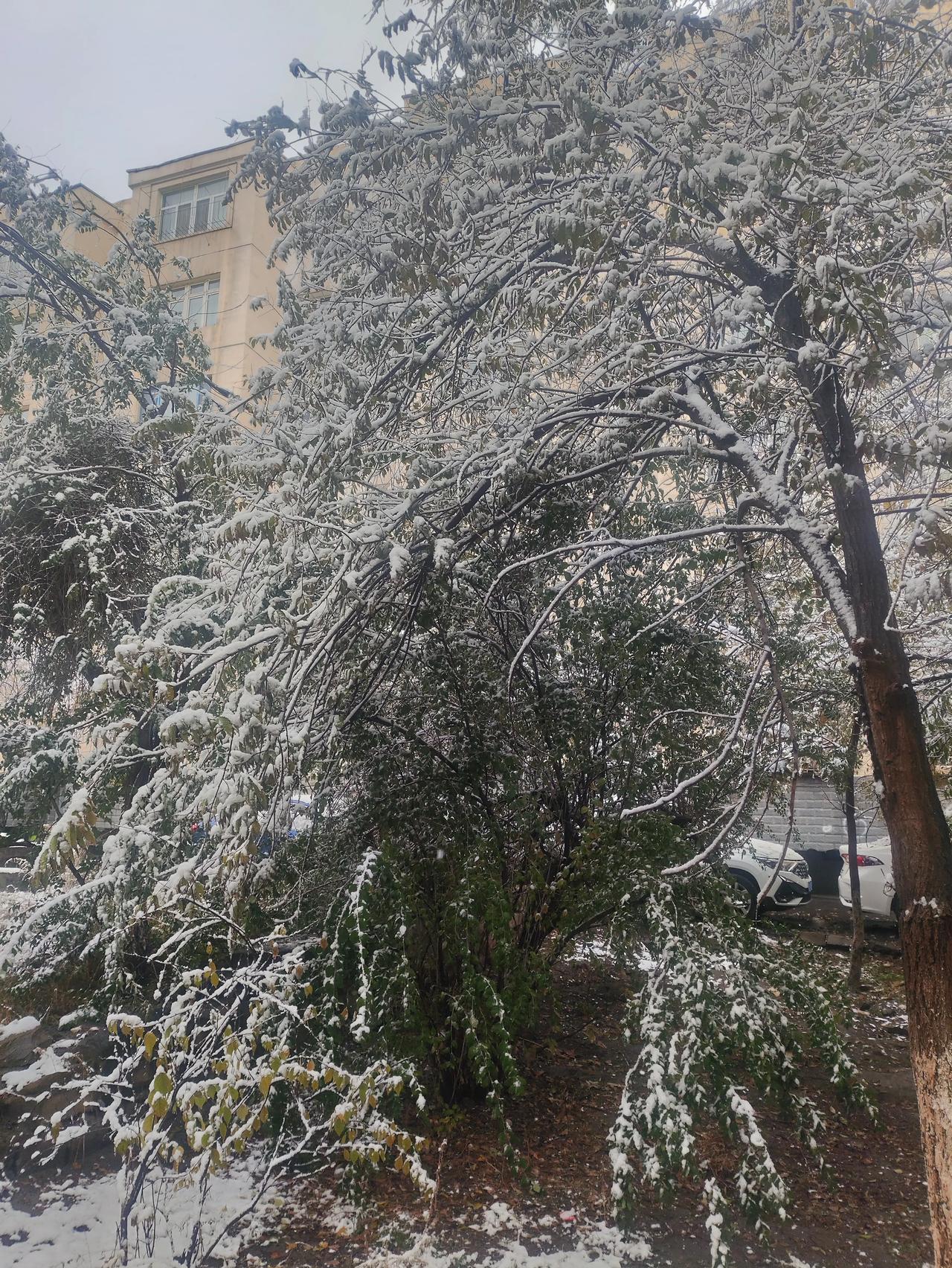 乌鲁木齐市经过大雪洗礼后的景色有些浪漫 昨晚到今天下午乌鲁木齐市下了近22个小时的雪,因为2025年的第二场雪比以往时候来的更早一些,让许多还有绿叶的树木不堪重付纷纷低下了高贵的头颅。 只是不知大雪压断的树枝砸坏了车辆保险给赔偿吗?真是损失大了呀!