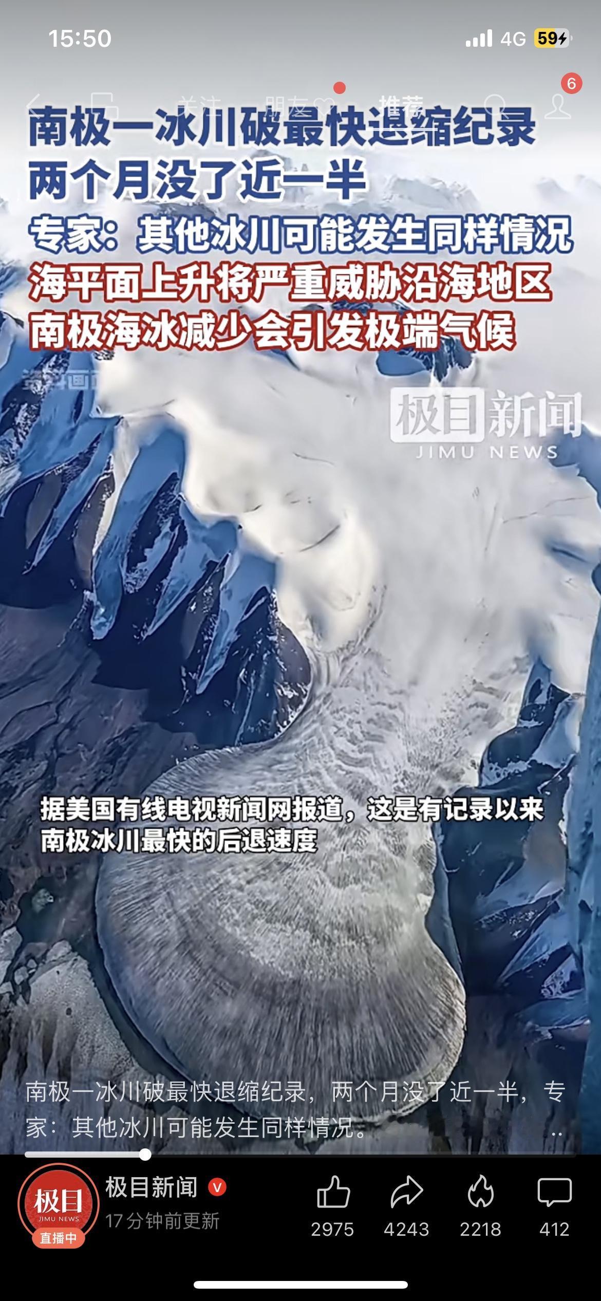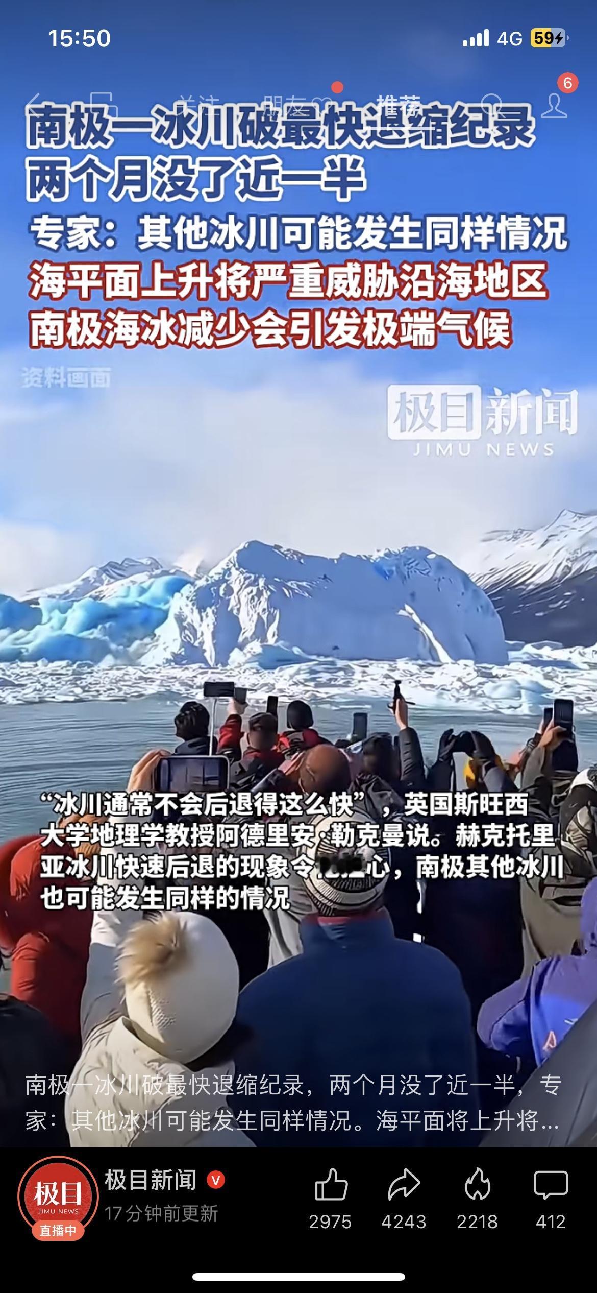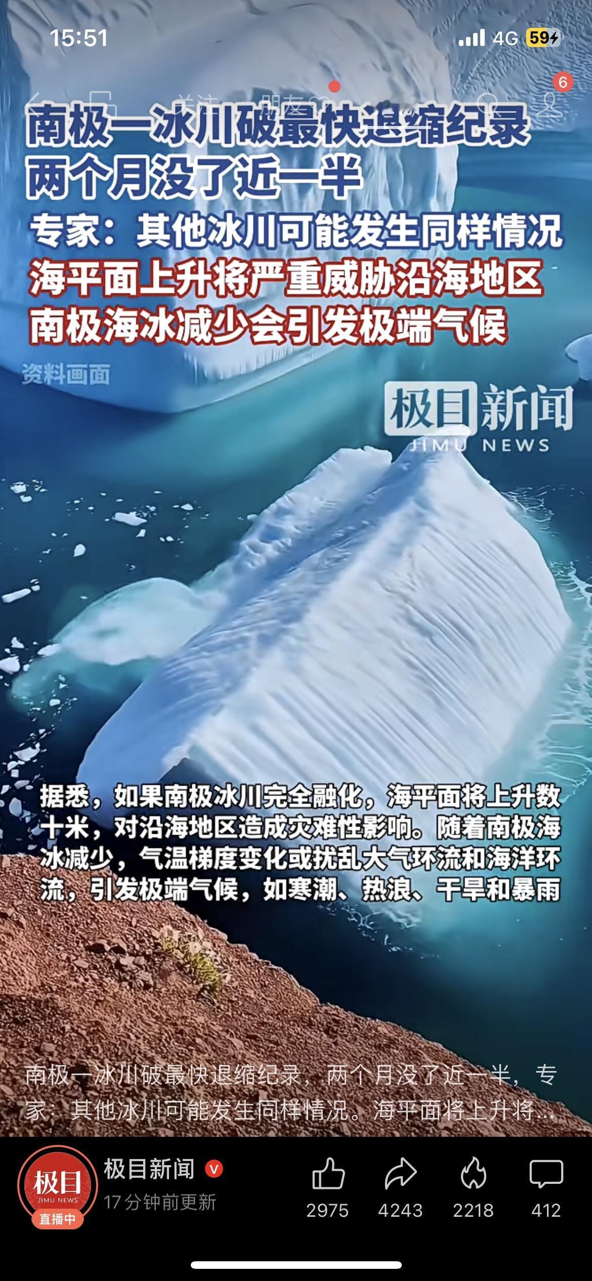 炸了!南极冰川2个月崩没一半,专家急了 刚刷到的消息头皮发麻:南极赫克托里亚冰川创下纪录——俩月直接缩没了近一半! 英国专家都说“从没见过冰川退这么快”,现在怕其他南极冰川也跟着崩。更吓人的是:这冰川全化了,海平面能涨几十米,沿海城市要遭灾,还会引爆寒潮、热浪这些极端天气! 今年你们那儿是不是也总遇到反常天气? 这事儿真不是“远在南极”的事,赶紧转给家人朋友提个醒 全球冰川融化 北极冰山 冰川
