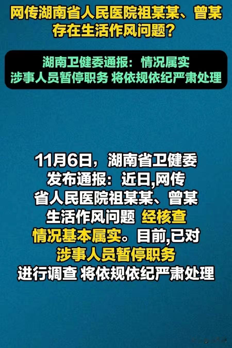 真没想到医院里还能曝出这种大瓜 湖南人民医院的祖某某和曾某,不雅视频在网上传得沸沸扬扬,现在俩人 已经被停职,三个星期前就先停诊了。 当事人祖某某早就报了警,记者采访也直接挂断,估计是被这事闹得焦头烂额。视频一泄露,不光他俩的名誉彻底毁了,家里的父母、孩子、配偶全被连累,好好的家庭被搅得鸡犬不宁,现在他俩怕是肠子都悔青了。 但话说回来,比起两人的过错,更让人愤怒的是泄露视频的人!这明显是侵犯隐私和肖像权,把别人的私事公之于众,给当事人和家人带来的伤害根本无法挽回。停职只是对当事人的处罚,揪出那个背后泄露隐私、恶意传播的始作俑者,才是最该做的事! 隐私再小也不能被随意践踏,你觉得泄露视频的人该受到怎样的惩罚?