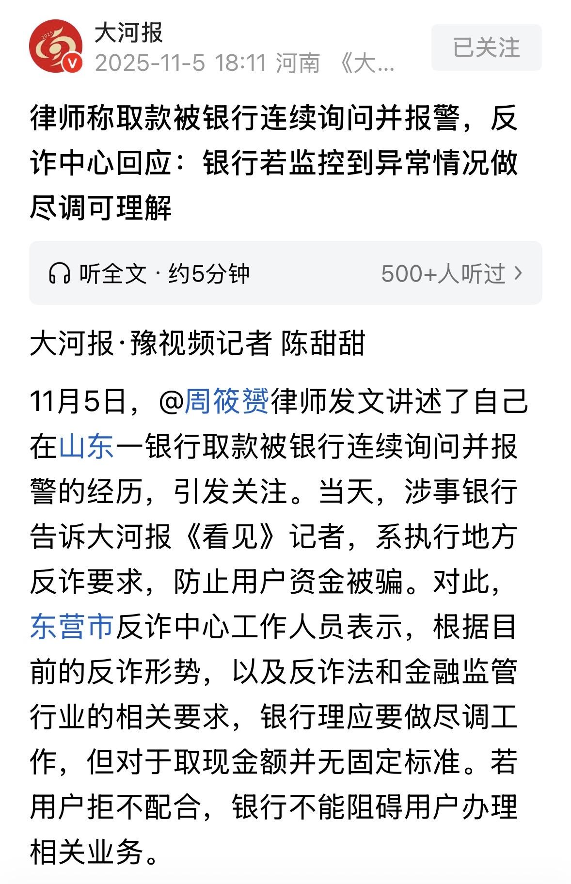 山东东营,男子准备给即将结婚的朋友包个红包,就去银行取现金,然而,柜员上来就发起三连问:什么用途?准备买什么?上个月有人给你转了一笔钱,这钱是什么钱?男子明确告诉柜员,自己取款低于5万,没有义务说明用途,可柜员却说,按当地规定,取1万以上必须告知,否则办不了,男子只好说这钱是拿去给朋友包红包的,原以为解释完就能取钱了,谁知柜员竟说已经反映给反诈中心,需要等警方过来核实…这让男子十分郁闷。 周筱赟是名律师,2025年11月初,他来到东营出差,恰好最近一个好朋友要结婚了,他就打算包个红包表达心意。 朋友结婚,他心里挺高兴的,想着毕竟是人生大事,他就准备给朋友包个大点的红包。 于是,他顺路走进一家银行,准备取个几万块现金出来,但不超过5万。 他原本还寻思,这么简单个事儿,几分钟就能搞定。谁知,刚坐下柜台前,麻烦就来了。 柜员是个年轻姑娘,一上来就问:您取这笔钱干什么用? 周筱赟愣了一下,心里有点纳闷:取自己的钱还要报告用途?他随口答了句“个人消费”。 谁知柜员不依不饶,追问道:具体买什么呀?还有,上个月某天,有个叫某某某的人给您转了几块钱,那笔钱是什么来头? 周筱赟一听,火就上来了。他觉得这像是在审犯人,自己好歹是个律师,懂点法律,央行规定明明写着低于5万块取现,储户不用说明用途。 他压住脾气,提醒柜员,说按规定,我取这点钱没义务解释。 可柜员一脸为难,说我们这儿规矩不一样,取超过1万就得说明,不然不给办。 周筱赟心里憋屈极了,这不就是在逼人自证清白吗?他只好解释,自己是给朋友结婚包红包,个人消费。 结果,柜员接下来的话让他大跌眼镜,对方竟说已经打了反诈中心和派出所电话,没人接。只能等警察过来核实了,您稍等。 这下,周筱赟彻底炸了锅。他坐在那儿,一股无名火直冲脑门。自己取个钱而已,又不是干啥坏事,银行有必要这么折腾客户? 这年头,储户来银行办业务,银行先当你是犯罪嫌疑人,逼着你证明自己没问题。 周筱赟觉得,银行这么搞,就是在侵犯隐私权吗?现代社会讲究法制精神,这举动简直是在踩红线。 他越想越气,觉得银行把一件小事搞得跟天塌了似的。 几天后,这事儿在媒体那边闹开了。有记者采访了涉事银行,工作人员解释说,银行的规定是取现超过1万块,都得提供用途和资金来源。东营这边管得特别严,反诈中心要求所有银行都这么做。 工作人员又说了,不光我们,东营市所有银行都这样。反诈中心开过会,强调防范诈骗,必须核实资金来源。万一用户被骗子洗脑了,编个理由取钱,我们得保护用户财产啊! 他还补充,取钱超过5万,还得先通过手机APP预约,预约成功后第二天才能取。 反诈中心那边也有回应。 中心工作人员说,银行做些调查工作是应该的,但没固定标准。他们会看账户流水、用户行为有没有异常。 如果银行发现不对劲,比如用户说话支支吾吾或金额不合理,就会启动调查。骗子常教受害人怎么糊弄银行,所以银行核实时会叫公安联动劝阻。 但工作人员也强调,如果用户死活不配合,银行又查不出问题,就不能卡着业务不给办,因为用户合法权益得保障。 周筱赟的经历,说白了就是一场隐私权和反诈行动的拉锯战。 他作为律师,觉得银行太粗暴,动不动就把储户当嫌疑人审问,但银行和反诈中心也有苦衷,诈骗案频发,他们想保护用户钱袋子,不能坐视不管。 那么,从法律角度,怎么看待这件事? 《民法典》第1032条规定:自然人享有隐私权。任何组织或者个人不得以刺探、侵扰、泄露、公开等方式侵害他人的隐私权。 法银行要求周筱赟律师说明取现用途、资金来源,并要求其“自证清白”的行为,已触及隐私权保护的法律边界。 周筱赟取款金额低于5万元,根据央行原规定无需说明用途,而银行以“东营市反诈中心规定”为由强制要求披露具体用途等等…实质是对储户私密信息的强制收集。 根据《商业银行法》第29条,商业银行应保障“取款自由”,而银行单方面以“内部规定”突破央行关于5万元以下取款无需登记的规则,构成对储户权利的不当限制。 反诈中心虽强调“警民联动”,但法律并未授权银行通过“自证清白”方式开展尽调,此举实质将举证责任倒置于储户。 对此,你怎么看? 关注@运良说法. 学法律知识不迷路