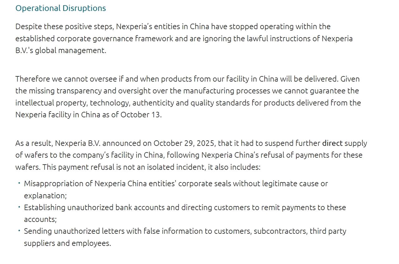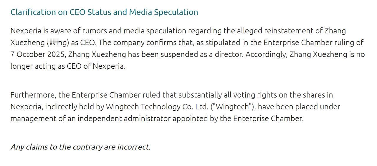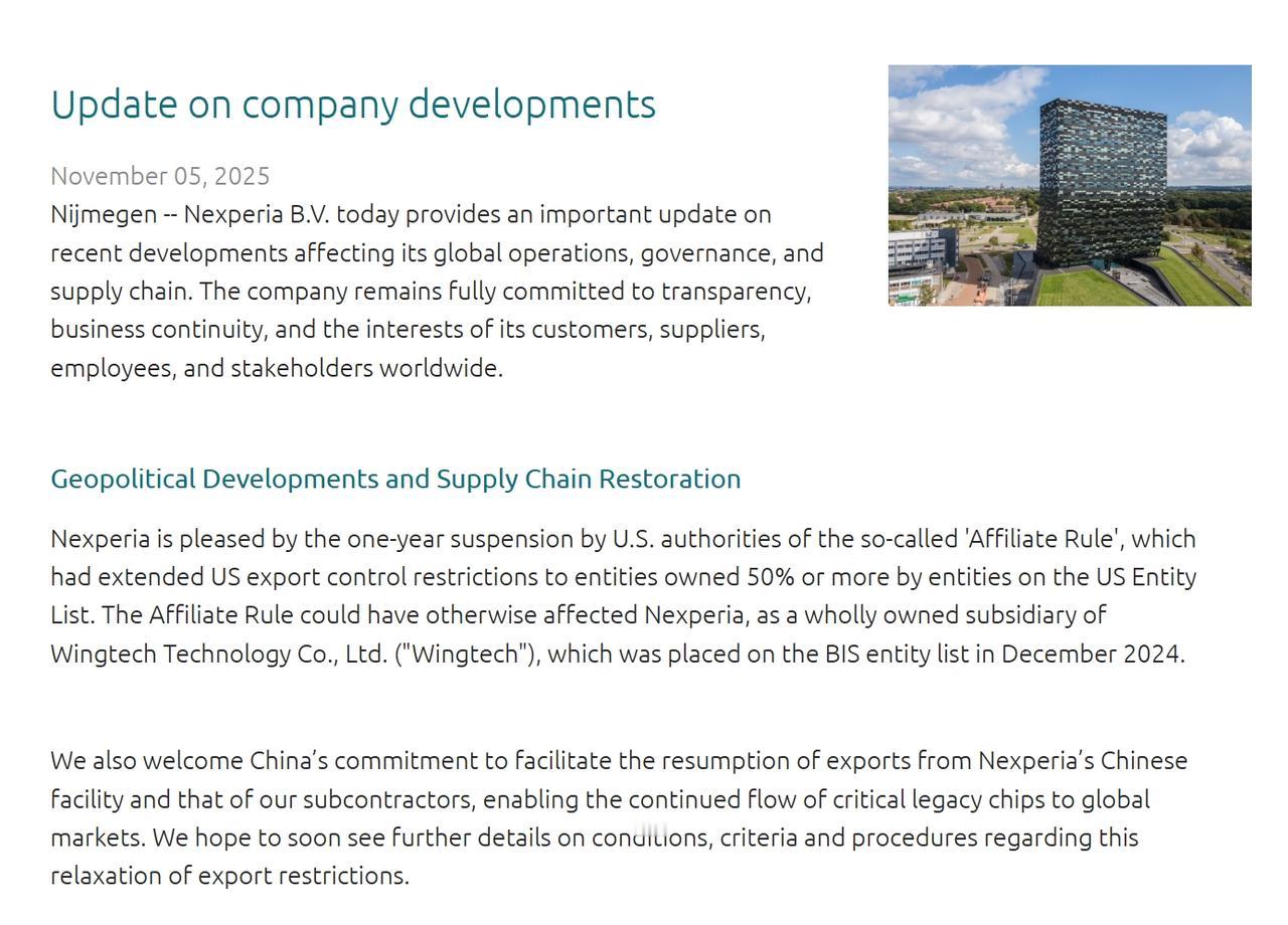 荷兰安世半导体,11月5日在官网上更新了一条消息。回应了目前事件进展,以及他们对这件事的真实态度。 它的官网很少发布消息,即使是出了这么大的事,在此之前,也是简短地发了一个声明。 这次说了什么呢? 一是提到了美国对50%的穿透性规则,暂停实施一年,荷兰安世表示“欣慰”,它承认,在此之前,美国的BIS实体清单,原本对公司会产生影响。 现在,潜在的危险不在了。 荷兰安世认为,既然中国工厂承诺恢复出口便利,希望能兑现承诺,从而确保关键芯片能够继续供应。 只是放宽出口限制的条件、标准和程序,没有更多细节。 (荷兰安世应该很清楚,出口豁免,是中国方面释放的善意信号,之所以没有这些细节,其实是希望荷兰方面也有善意回应,双向奔赴,在看到真正解决问题的诚意之前,应该不太可能就无条件地恢复供应)。 二是继续硬刚。 荷兰安世说中国实体脱离了公司的治理框架,并且无视安世全球管理层的合法指示。 (意思是中国工厂应该继续听令于荷兰安世,这一条,显然是针对中国工厂之前的“独立运营”说的,但问题的症结,荷兰安世应该也非常清楚,中国工厂始终对荷兰的全球冻结令存有异议。) 荷兰安世认为,中国公司不听从荷兰安世这边的指令,所以,对中国工厂产品、交付,都不了解,也不保证中国工厂交付产品的知识产权、技术、真实性和质量标准。 (总之不提供背书,这一招对欧洲客户可能管用)。 荷兰安世说,中国工厂不支付晶圆货款,所以才断供晶圆,中国工厂认为,荷兰安世还欠着中国工厂这边10亿货款。 (到底谁说的是真的,还是双方说的都是真的?) 荷兰安世现在纠结于三个方面: 一是认为中国工厂擅自使用安世中国实体的公司印章; 二是开设未经授权的账户,并让客户将款项汇入这些账户; 三是向客户、分包商、第三方供应商和员工发送未经授权的文件。 (总之,没有荷兰安世那边的同意,现在中国工厂做什么,它都认为是不合法的)。 荷兰安世说,并没有完全停止晶圆发货,安世所有其他生产基地,包括欧洲、亚洲其他地区的生产基地,都正常运营(意思是,只是停止向中国工厂供应晶圆)。 荷兰安世仍然说,将全力投入在中国的业务,认可中国东莞工厂的生产活动,认为这对安世的长期战略和成功,仍然至关重要。 荷兰安世进一步确认,张学政的职务没有恢复,已经不是安世的CEO。闻泰科技间接持有的安世股份,以及投票权,目前都在指定的独立管理人那里((这是对目前网上传言的已恢复职务的消息的澄清,意思是荷兰仍然依法办事)。 荷兰安世表示,仍将遵守荷兰政府之前的冻结令(这是要刚到底了)。