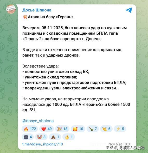 昨晚,俄军位于前顿涅茨克机场的无人机基地遭到乌军导弹和无人机袭击,超过1000架俄军无人机和1500枚弹头就地销毁。据悉,此次袭击是“马扎尔之鸟”无人机部队经过数月策划实施的。