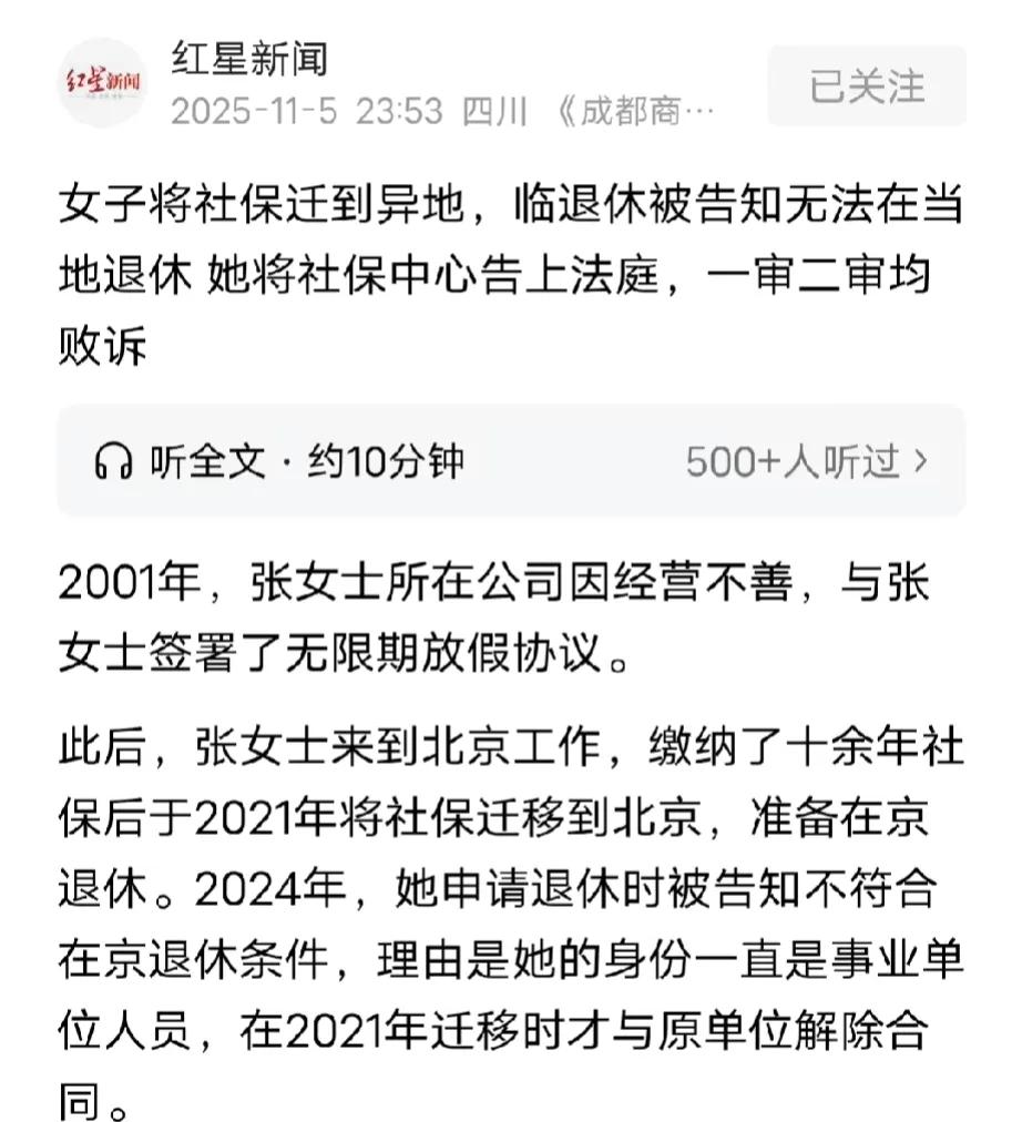 北京,女子所在单位经营不善与她签署了无限期放假协议,之后,女子到北京工作,在北京交了10年社保,2021年女子与原单位解除劳动合同并将社保移到北京,2024年女子到了退休年龄,在北京申请退休,谁料,社保局告知女子:无法在当地退休,理由是女子3年前才与原单位解除合同,不符合在当地退休条件。女子不服,告上法庭,法院经过两审判决,得出的结果让女子意外。 据悉,张女士是河北昌黎县人,在2001年之前,她一直在昌黎县某房地产开发总公司做事。 2001年,公司因为经营管理不善,导致解体,没法继续经营,就跟张女士签了“无限期放假待业”的协议。 协议里写明,公司每个月发给张女士120元的生活保障金,另外由工会托管帮张女士缴纳养老金。 除此之外,公司也明确,在她待业期间,张女士可以找其他合法合规的工作来补贴生活。 每个月120元的生活费,对张女士来说根本不够用,这么点钱跟失业没什么区别。 为了生计,张女士先是在当地试图找工作,但,找了很长一段期间,一直找不到合适自己的。 不久后,张女士决定离开家乡去北京,她认为大城市机会多,工作应该好找。 果不出她所料,来到北京不久,张女士就找到了心仪的工作。 她这一待,就在北京待了很多年,2009年,张女士在北京交了社保。 不过,她虽然在北京工作了,但,一直没有跟原公司解除劳动合同。 直到2021年,她才向某社保基金管理中心咨询,了解到自己可以把社保迁移到北京并在北京退休。 之后,张女士就办理了社保迁移,将在老家昌黎的基本养老保险关系转移到北京,同时也与昌黎县房地产开发总公司解除劳动合同,期间两地重复交纳的养老保险还退还给了她。 事后,北京社保局给河北昌黎县的相关部门发了一封正式函件,专门对接办理张女士的养老保险关系转移手续。 张女士以为,自己交满期限的养老保险后,到了退休年龄就可以在北京领取退休金。 但,她想错了。 2024年,张女士到了退休年龄,就在她准备去办理退休时,北京社保局工作人员告知张女士,她没办法在北京办理退休。 他们给出的理由是,张女士到2021年才跟原工作单位解除劳动合同,从2021年到2024年也就3年的时间,张女士在京实际缴费年限不足10年。 同时,她的户籍也不在北京,因此不符合在北京办理退休的条件。 张女士一听瞬间傻眼,虽然她是2021年才跟原工作单位解除劳动合同,可她是2009年就在北京交了社保。 从2009年到2024年也有10来年了,怎么就不能在当地办理呢? 张女士称,2021年她向社保局咨询时,得到的答复是可以转移并在北京退休。 如果她早知道是这种情况,她肯定会在2009年的时候,就把社保迁到北京。 退一步说,就算真的不符合转移条件,社保中心那时候也该查出来,然后拒绝给办转移,这样就不会弄到现在想退都没地方退的地步了。 张女士认为,这是社保局的失职,她把社保局告上法庭,要求享受养老待遇。 可社保中心认为,她建立的是临时账户,且解除原机关事业单位关系时已年超40岁,不符合条件。 法院指出,张女士在仍属机关事业单位人员期间,北京社保中心就为她建立了企业养老保险账户,后来又在她超龄后为她建立了非临时账户,这些操作都存在错误,社保中心应纠正并以后更谨慎。 不过,法院一审最终,支持社保中心,认定她不符合在北京退休的资格。 张女士不服提起上诉,二审维持原判。 那么,从法律角度,如何看待这件事呢? 《城镇企业职工基本养老保险关系转移接续暂行办法》第5条规定,参保人员跨省流动就业,女性年满40周岁的,应在原参保地保留养老保险关系,新参保地建立临时账户,达到待遇领取条件时需转移归集至原参保地或待遇领取地。 张女士2021年转移社保时已超40岁,按规定北京社保中心应为其建立临时账户,但其违规建立非临时账户,操作存在错误。 但临时账户本质不具备在京退休资格,即便账户性质有误,张女士仍需将账户归集至原参保地,法院据此未支持其在京退休诉求,既指出社保中心失误,也坚守退休资格核心规定。 《社会保险法》第16条规定,参加基本养老保险的个人,达到法定退休年龄时累计缴费满十五年的,按月领取基本养老金;累计缴费不足十五年的,可缴费至满十五年或转入城乡居民养老保险。 该法条明确退休领取养老金的核心条件是累计缴费满15年,但异地退休还需满足地方补充规定。 张女士虽总缴费年限达标,但2021年前与原单位未解除劳动关系,此前在京缴费未被认定为有效本地缴费年限,且户籍不在北京,未满足北京“本地缴费满10年”的异地退休要求。 故不符合在京领取养老金条件,法院两审维持原判符合法律规定,同时也明确社保中心需纠正账户建立错误。