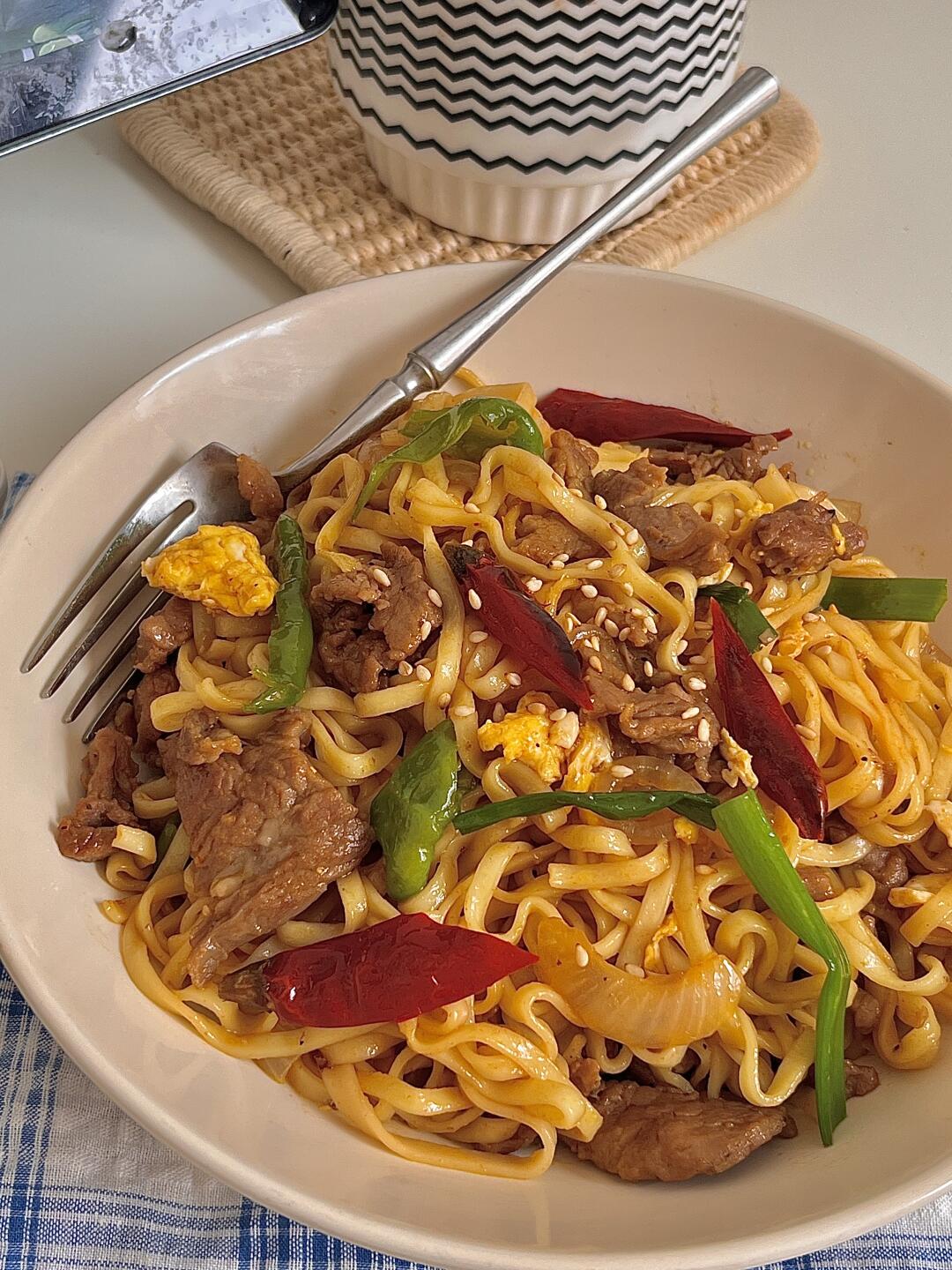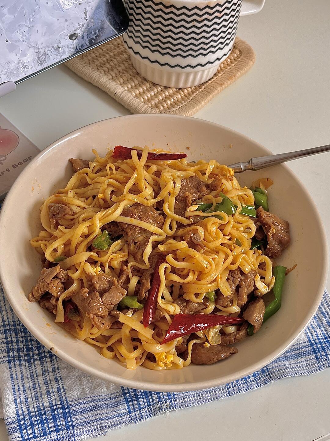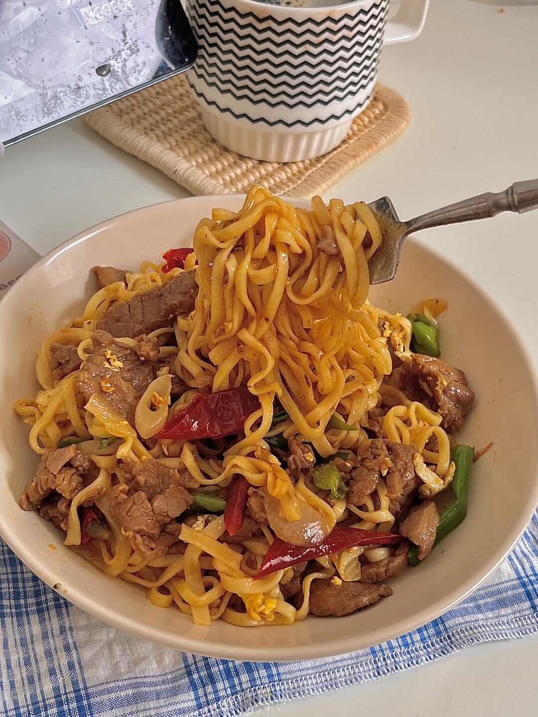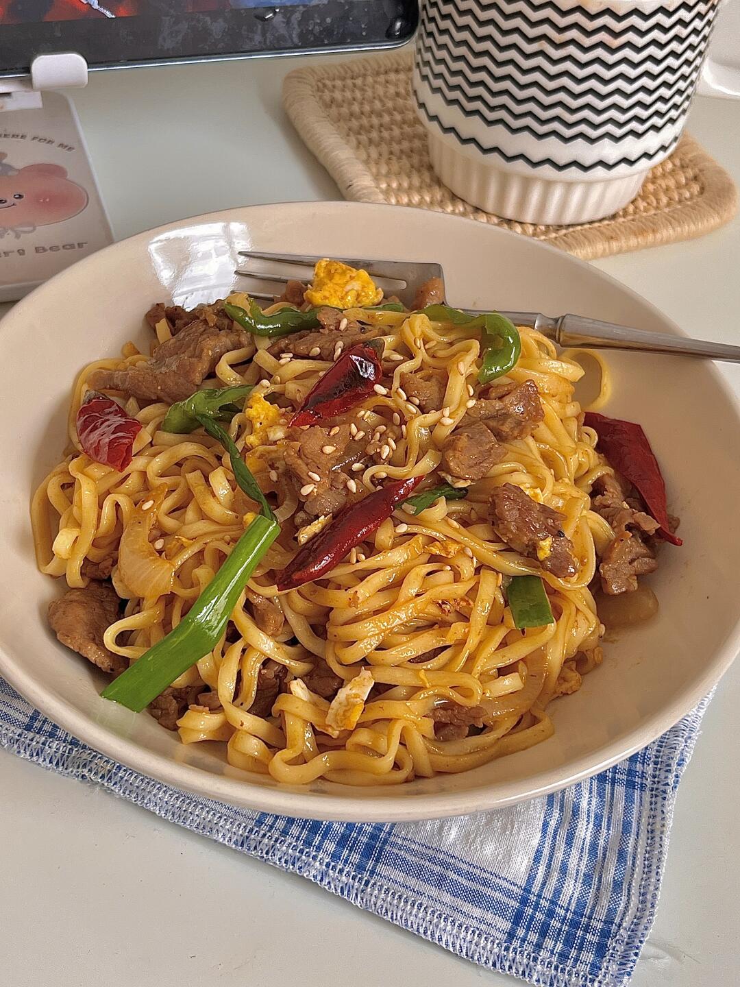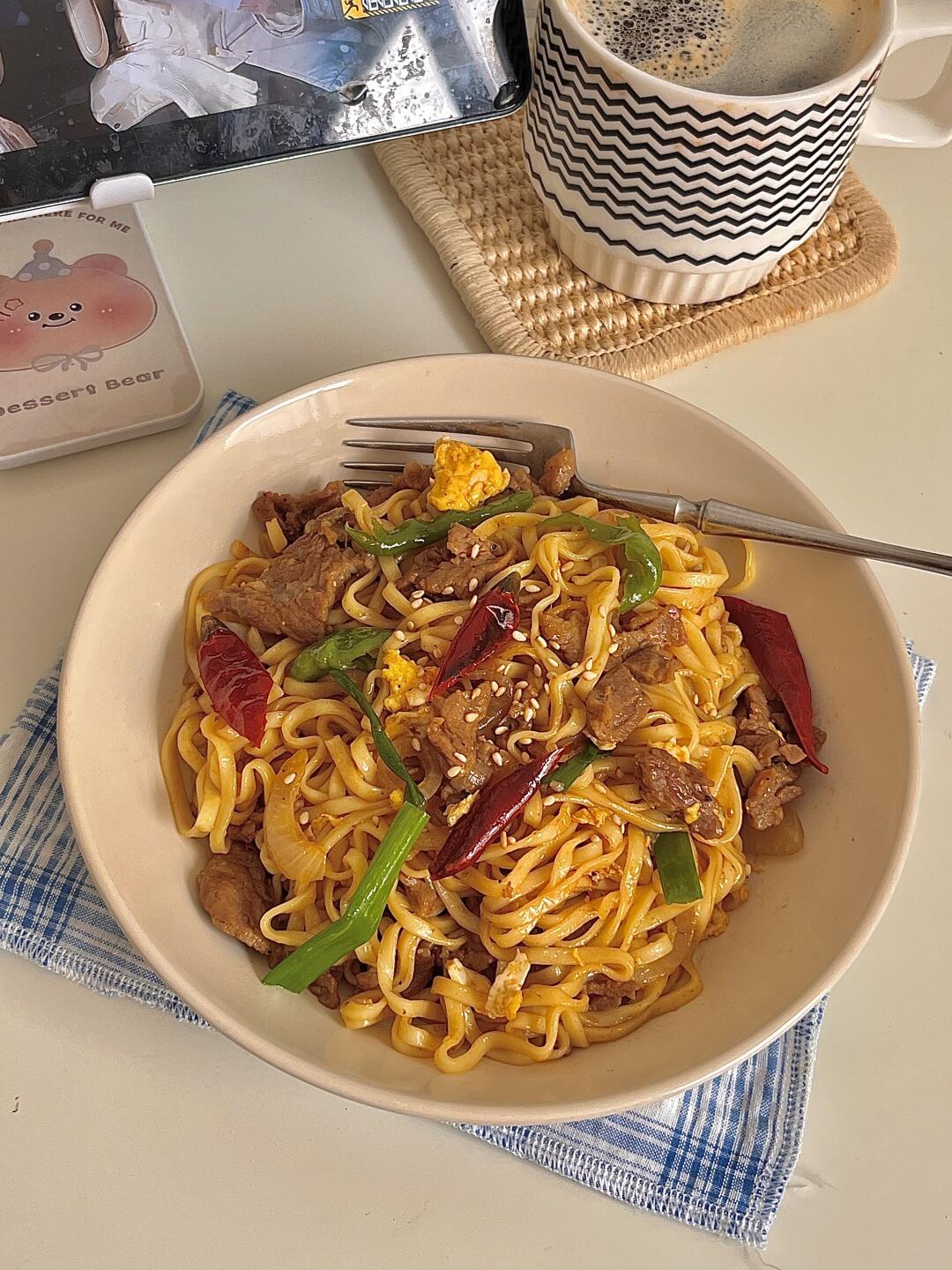 我家的夏日凉方 🍴今日份一人食: 牛肉炒面 美式 . 牛肉炒面[哇R]是吃一次就会爱上的那种,牛肉焦香嫩滑,放辣椒🌶️超带劲的,巨香,碳水脑袋狂喜,斯哈到停不下来[赞R]爱吃的宝一定要试试呀✌🏻