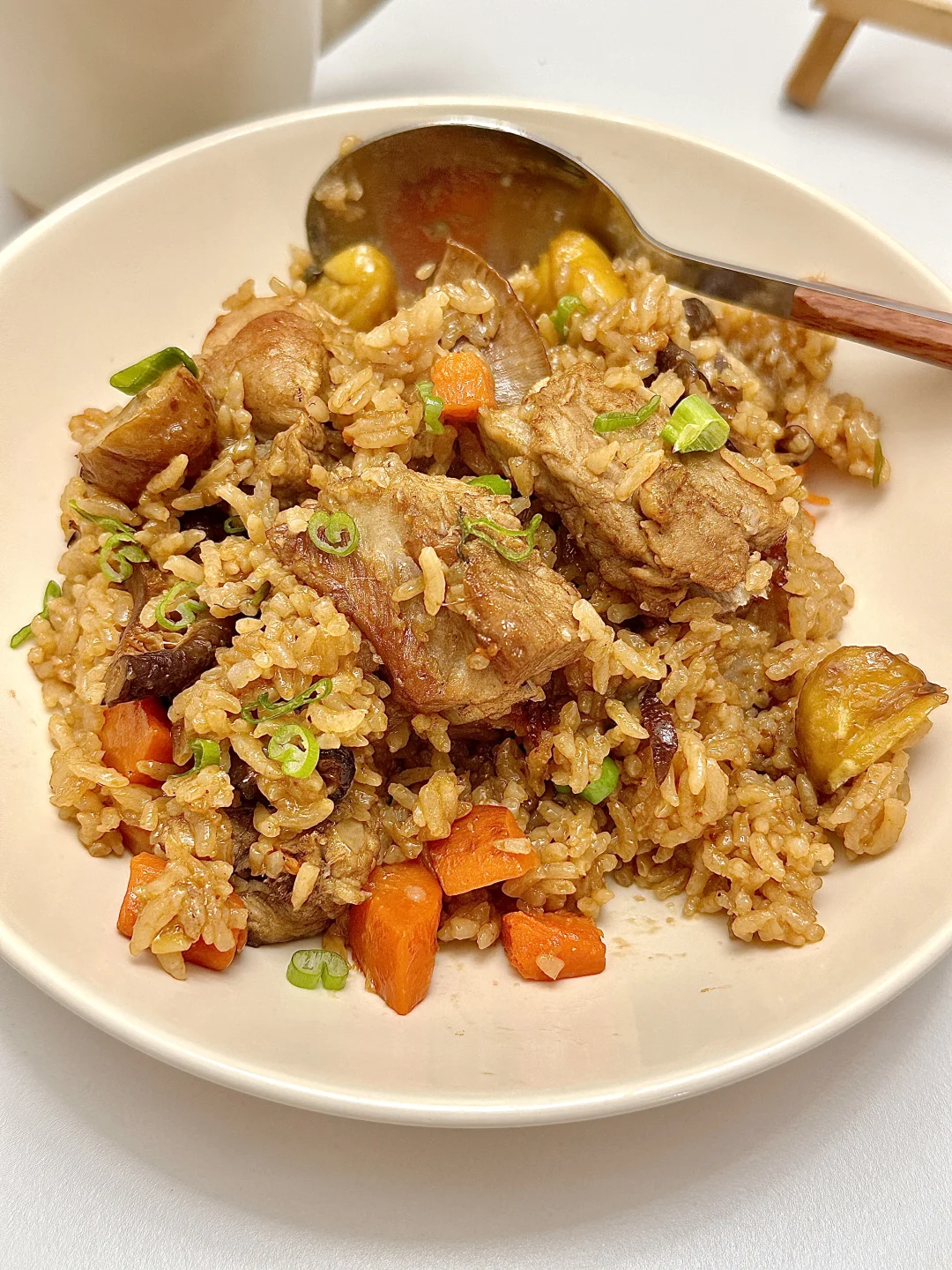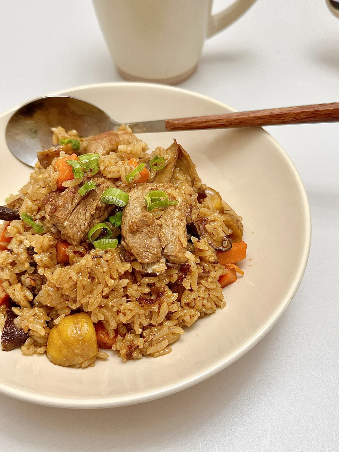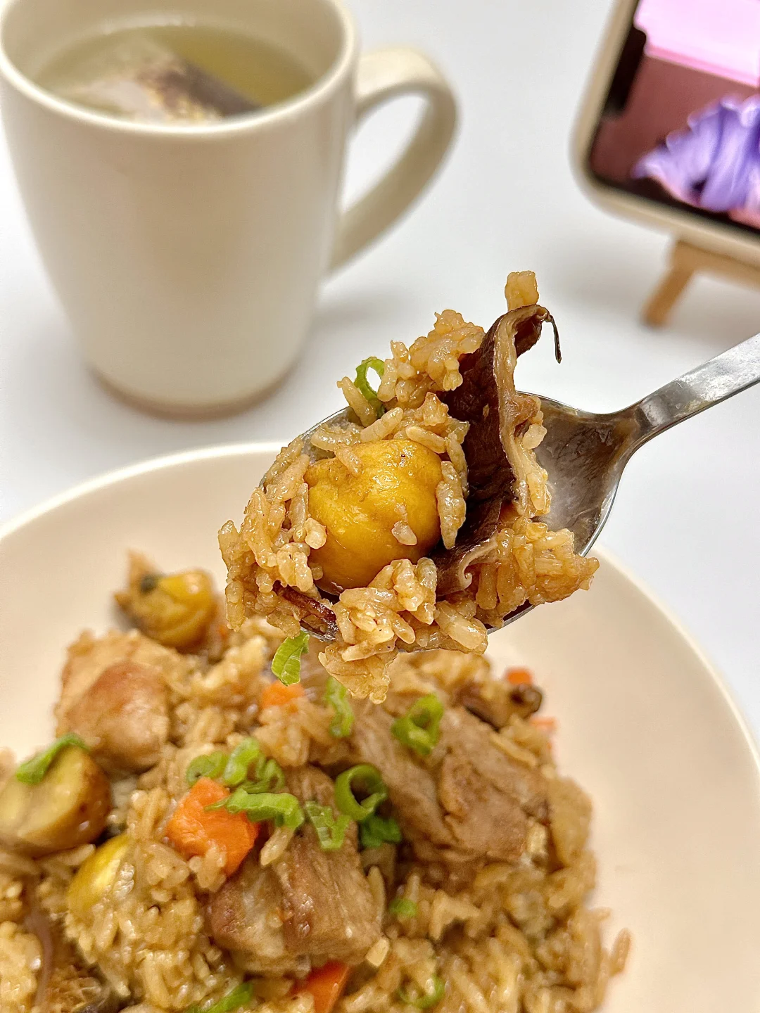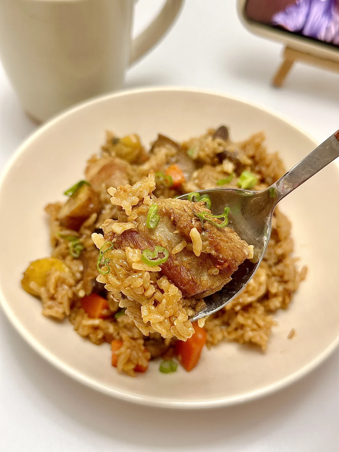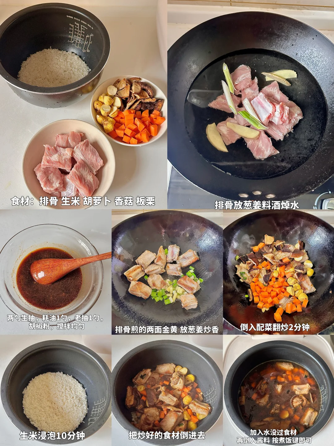 冬天得吃一次板栗排骨焖饭呀,排骨焦香脱骨 板栗香甜粉糯,香迷糊了,真想再吃一碗! 🥬食材:排骨,大米,胡萝卜,香菇,板栗🌰 👩🏻🍳做法: 1️⃣排骨冷水下锅加料酒,姜,葱焯水 2️⃣酱汁:2勺生抽,1勺老抽,1勺耗油,黑胡椒粉搅拌均匀 3️⃣少油下排骨煸出油脂煎至金黄放葱姜炒香 放入胡萝卜,板栗,香菇翻炒2分钟 4️⃣把炒好的食材放电饭煲里 加酱汁和水没过食材 按煮饭键即可