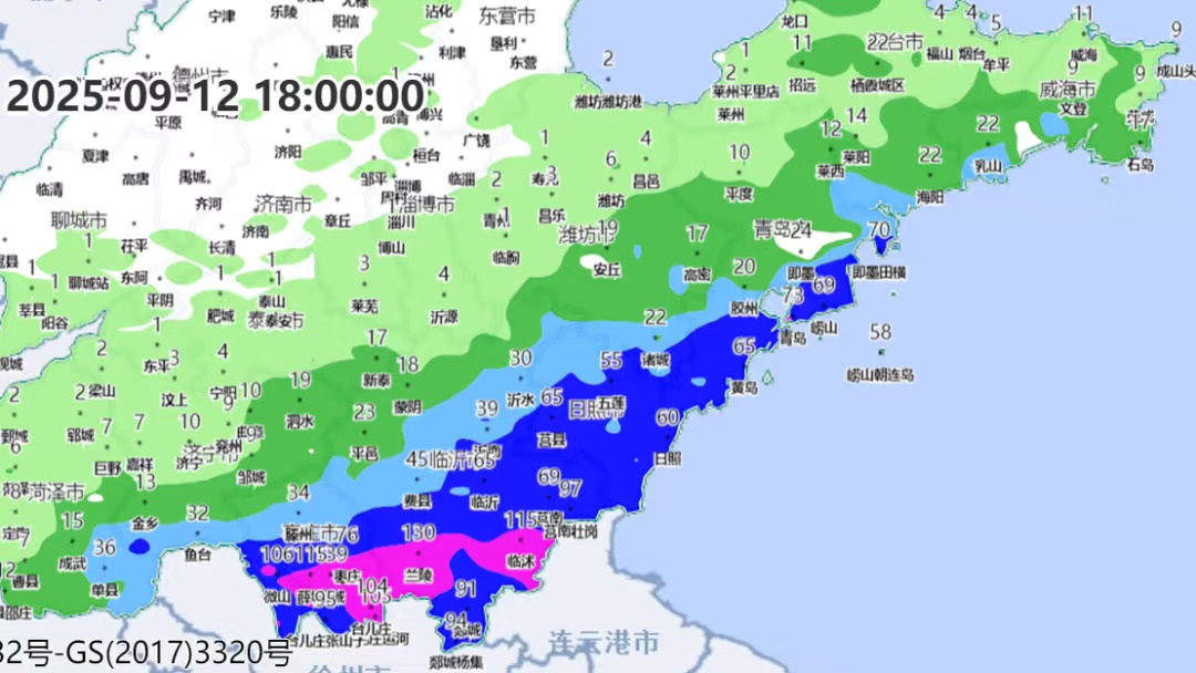 从实际降雨量分布图中可以看到,这场降雨在提前两天的预报中准确率还是相当高的,不过和初期的预报相比差距较大,因为一直在向南调整。 截止今晚,鲁东南和半岛南部地区普遍出现大到暴雨,枣庄、临沂、济宁微山、青岛部分站点出现大暴雨,最大降雨量更是达到178.3毫米,出现在枣庄薛城区周营站。