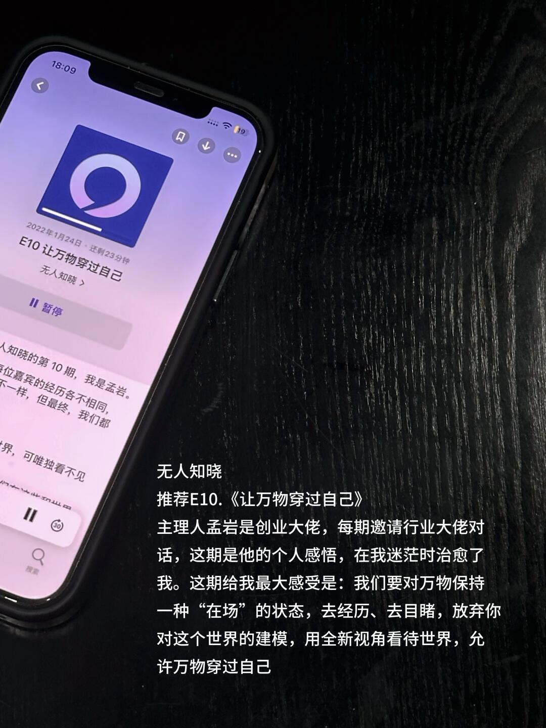主理人孟岩是创业大佬,每期邀请行业大佬对话,这期是他个人感悟,在我迷茫时治愈了我。这期给我最大感受是:我们要对万物保持一种“在场”的状态,去经历、去目睹,放弃你对这个世界的建模,用全新视角看待世界,允许万物穿过自己