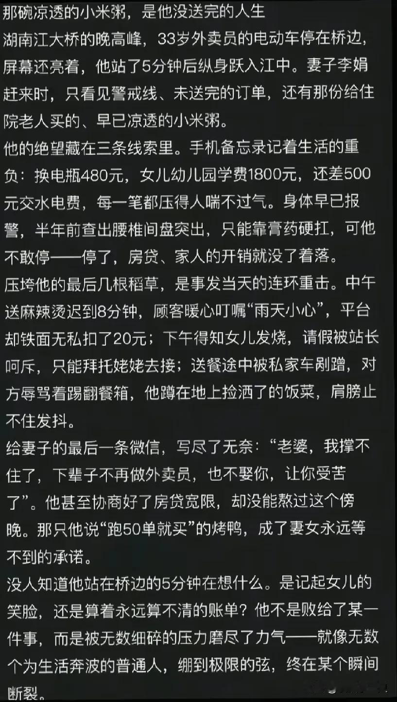 33岁外卖员桥边纵身一跃,悲剧背后,是无解的困境 他送完最后一单,站在桥边,写了遗书,然后跳了下去,33岁,生命就此结束,遗书里,写满了压力,对家庭愧疚,也写满了对职业的绝望。 经济压力太大了,换电瓶要480,女儿幼儿园还差500学费,水电费没交,还有房贷,家里每天都要花钱,他要挣钱,可是挣不到。 半年前查出腰间盘突出,疼的要命,不能休息,只能硬撑,平台太狠了,下雨天送麻辣烫晚了八分钟,扣20,送餐的时候还不小心碰了别人的车,被车主骂,还被一脚踢翻保温箱。 答应女儿老婆,跑满50单,买烤鸭,最后也没买成,晚饭,老婆给他留了排骨汤,他没喝到,他还刚协调好的延期房贷,却没有熬过这个傍晚,他太累了。 外卖员,都是这样吗,每天跑,挣不到钱,也没有保障,平台规矩太硬了,一点人情味都没有,社会救助,好像帮不上忙,个人再厉害,也扛不住,家庭支柱没了,以后怎么办,为了生活,放弃生命,值得吗,对家庭的责任,他尽力了,可是没用。