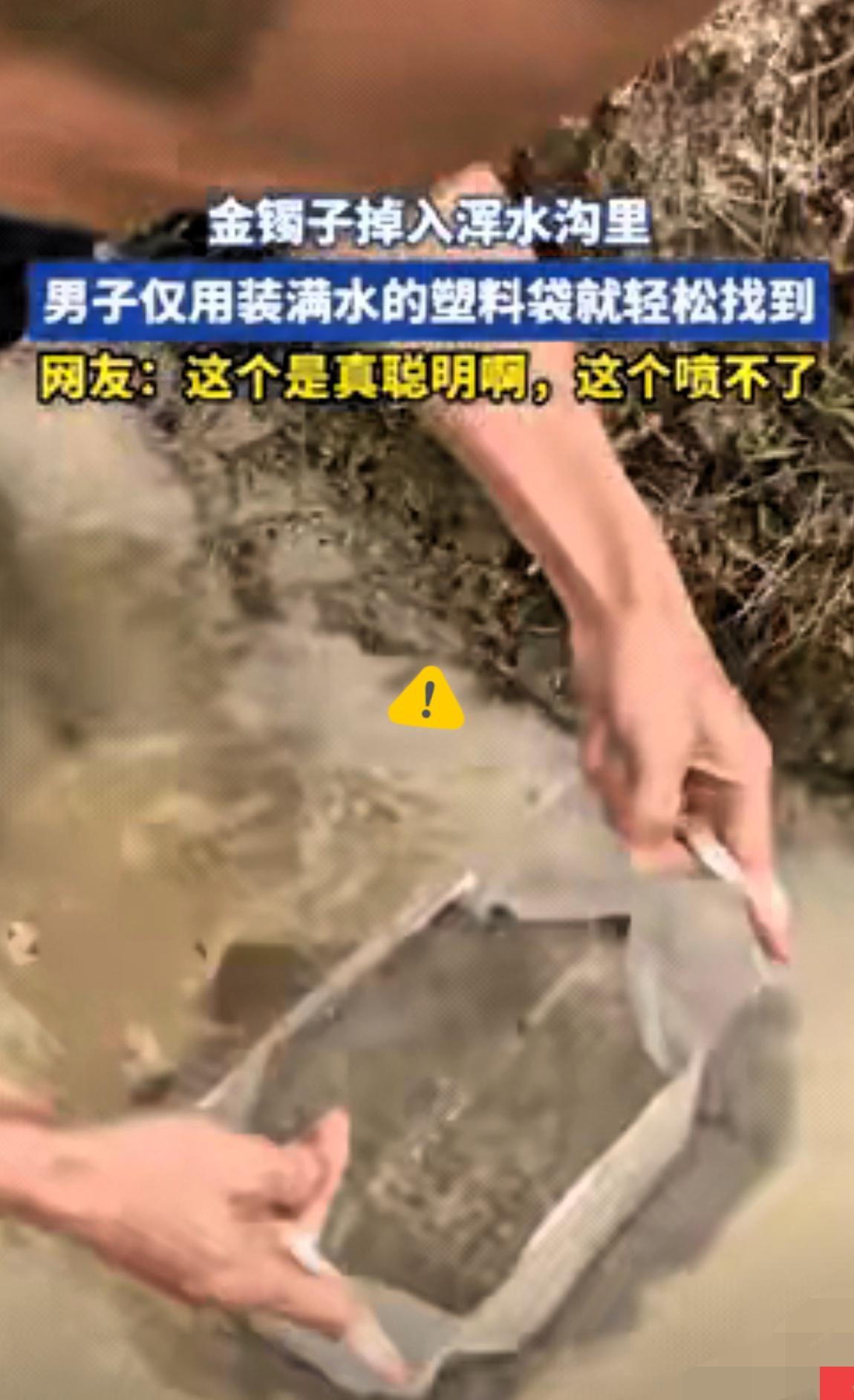人怎么能聪明成这样?福建,男子不小心把金镯子掉进了水沟里,找了半天没找到,他又不想放弃,于是想出了一个小妙招,网友看后直呼聪明。 你猜他用了啥?就一个装水的塑料袋,往浑水沟里一放,底下的泥啊、石头啊,瞬间看得清清楚楚,第二次试就把金镯子“照”出来了。这招绝就绝在,没人规定塑料袋只能装东西,换个思路,它就是个简易“透视镜”。 生活里的智慧往往就藏在这种“不按常理出牌”里。有人用塑料盒捞河里的戒指,有人用吸管喝奶茶不沾口红,说白了,都是把普通东西用出了新花样。可话说回来,再巧的办法也不如一开始就把贵重东西收好——毕竟,靠智慧救场是本事,但少掉坑才是真省心。 你平时有没有过这种“灵机一动”解决难题的经历?说来听听~