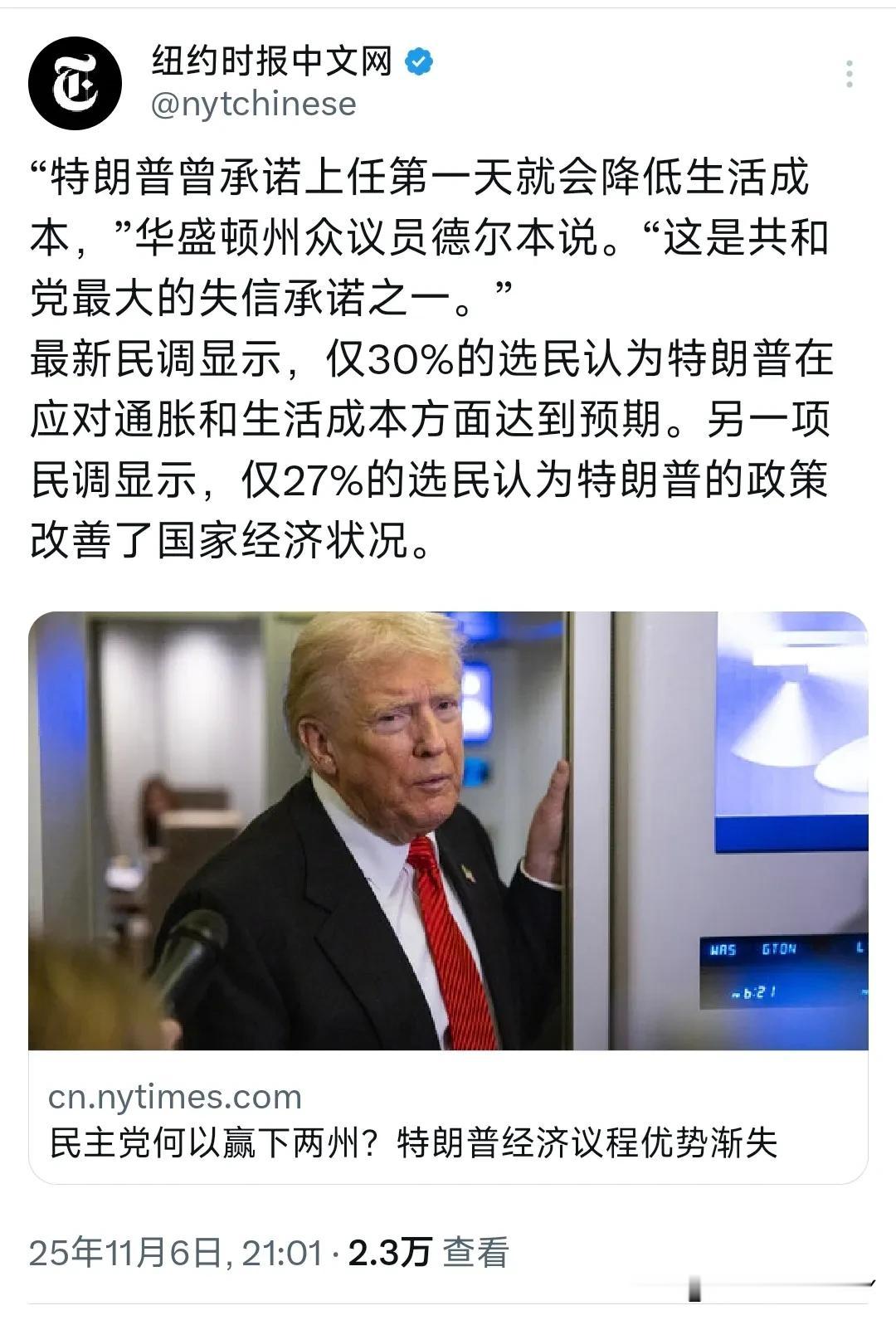 特朗普昨晚(11月6日晚)发文写道:“沃尔玛表示,特朗普执政下的2025年感恩节晚餐比拜登执政下的2024年感恩节晚餐便宜25%。我的所有开销都比民主党人低,尤其是石油和天然气!所以民主党人所谓的‘负担能力’问题根本站不住脚!别再撒谎了!!!” 特朗普这番表态看似言之凿凿,实则如同空中楼阁,缺乏全面的数据支撑。经济运行是复杂庞大的系统工程,牵一发而动全身,仅凭单一商品的价格波动,怎能断定整体经济状况的优劣?这不禁让人想起“盲人摸象”的典故,只摸到大象的一角,便以为窥见了全貌,未免太过武断。 民调数据早已给出最真实的答案,仅有三成左右选民认可特朗普在应对通胀和经济改善上的表现。这个数字清晰地反映出美国民众对其经济政策的真实看法,与特朗普口中“成绩斐然”的自我描述形成鲜明反差。 要知道,民众的切身感受才是经济状况最直接的晴雨表。最新民调显示,约七成美国人表示食品杂货支出增加,六成称水电费支出上升,四成认为医疗、住房及汽油开销更高,超半数受访者认为特朗普政府的关税政策让家庭财务状况恶化。 这些数据无不说明,美国民众正承受着生活成本上涨的压力,所谓“开销更低”的说法,与民众的实际体验严重脱节。事实上,单一经济指标或商品价格根本无法全面反映整体经济状况。 正如专家所指出的,即便是GDP这样的核心经济指标,也存在诸多局限性,无法全面反映经济发展质量、财富增长、社会进步和人民生活水平的变化。特朗普拿感恩节晚餐价格说事,妄图以此证明自己执政时期经济向好,无异于“一叶障目,不见泰山”。 经济的好坏,需要综合考量就业、通胀、收入分配、财政赤字等多重因素。回顾特朗普执政时期的经济政策,其推行的减税法案虽在短期内刺激了经济增长,却未能实现削减赤字的目标,反而导致财政赤字高企。 而其倡导的高额关税政策,不仅未能达到预期效果,反而推高了国内通胀,损害了本国及贸易伙伴的经济利益,这与他口中的“开销更低”形成了鲜明的矛盾。反观美国当前的经济形势,67%的美国人认为国家“严重偏离正轨”,52%的人认为经济状况较特朗普上任时恶化。 这些民调结果充分说明,美国民众对经济现状普遍不满。特朗普此时急于为自己的经济表现贴金,或许是出于选举政治的考量,但脱离实际的自我夸赞终究难以赢得民心。经济政策的成效,不在于政客的自我标榜,而在于民众的真实感受。 当大多数人都在为生活成本上涨而焦虑时,单一商品的价格下降便显得微不足道。特朗普的这番说辞,暴露了其在经济认知上的片面性。经济治理需要系统思维和长远眼光,不能仅凭单一数据或个别现象就妄下结论。 无论是民主党还是共和党,制定经济政策的核心都应是改善民众生活,提升经济发展的可持续性。将单一商品价格作为攻击对手、标榜自己的工具,不仅缺乏说服力,更难以解决美国经济面临的深层次问题。 评判一位政客的经济执政成效,需要全面、客观的视角,兼顾数据与民生,考量短期效益与长远发展。特朗普试图以感恩节晚餐价格为论据证明自身经济成就的做法,显然难以成立。 毕竟,事实胜于雄辩,民众的切身感受和全面的经济数据,远比单一商品的价格波动更有说服力。经济治理从来不是纸上谈兵,唯有脚踏实地解决民众关切的问题,才能真正赢得民众的认可与支持,这或许是所有政客都应铭记的执政之道。