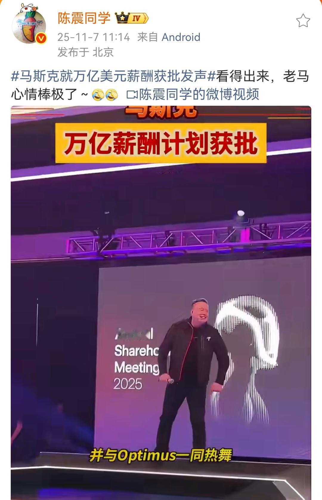 陈震:马斯克就万亿美元薪酬获批发声,看得出来,老马心情棒极了~[允悲][允悲] 这搁谁谁不开心呀10,000亿美元呀!注意1万亿美元! 普通人你就是给他100万美元,他也会高兴的跳舞呀,大多数人别说100万美元了,就是一年能挣个5万美元那也是非常有能力的人,毕竟折合人民币已经35万了。 各位是怎么看的?欢迎评论区留言。