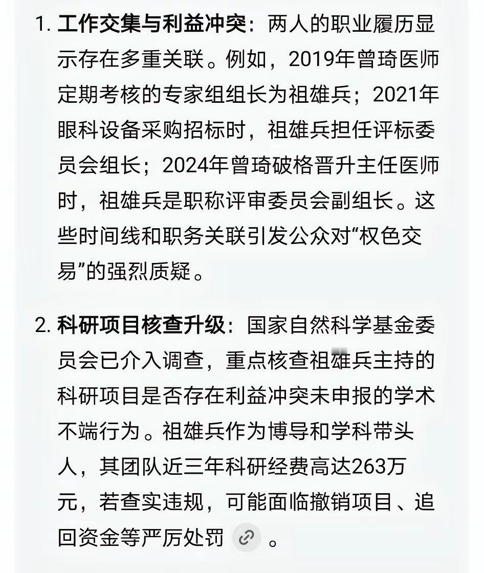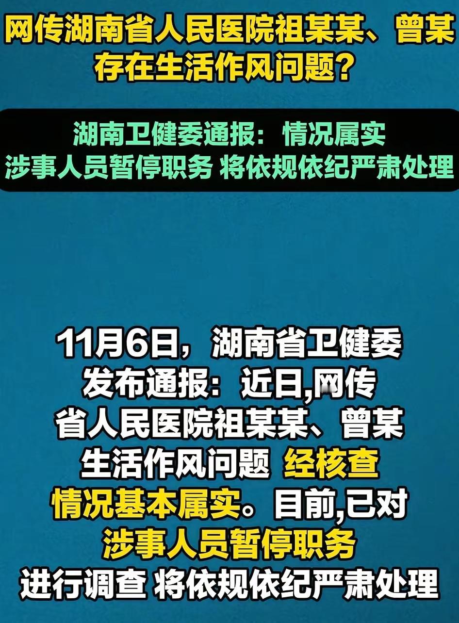 拔出萝卜带出泥,祖雄兵和曾琦在工作上存在交集与利益冲突,目前官方已表态会严肃处理。 截至2025年11月6日19时58分,湖南省人民医院副院长祖雄兵与眼科副主任曾琦事件的最新进展如下: 官方通报称情况基本属实,已启动停职调查。 两人的职业履历存在多重关联。 像这种关系,哪有真爱,肯定牵扯经济利益,这下闹大了,不单纯是男女关系的问题了,还有利益输送违法的行为了。 如果涉及到腐败问题,是咎由自取,如果是家庭出现感情危机,当另当别论了。拍者是冲腐败,若冲嫉妒,报复则的确有些不妥且品德不可恭维。 这家伙出名出大发了,都编成相声节目了,真是人言可畏啊。这俩人估计肠子都悔青了。最好都离婚组成新家庭靠两个人的精湛医术治病救人,是最好的结局。该伤害的方正也无法挽回了,就让时间慢慢抚平创伤吧。