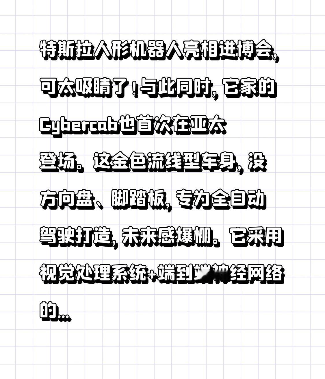 特斯拉人形机器人亮相进博会,可太吸睛了!与此同时,它家的Cybercab也首次在亚太登场。这金色流线型车身,没方向盘、脚踏板,专为全自动驾驶打造,未来感爆棚。 它采用视觉处理系统+端到端神经网络的自动驾驶方案,两座设计配超大后备箱,能满足打车和小型货运需求。计划明年二季度在北美量产,未来服务于无人驾驶网约车车队。细节上也很出色,金属本色免喷涂,环保又提效;无后挡风玻璃和外后视镜,风阻低,1度电能跑近10公里。还配备无线充电和机械臂自动清洁功能,为落地做足准备。不得不说,特斯拉这波科技秀太牛了!