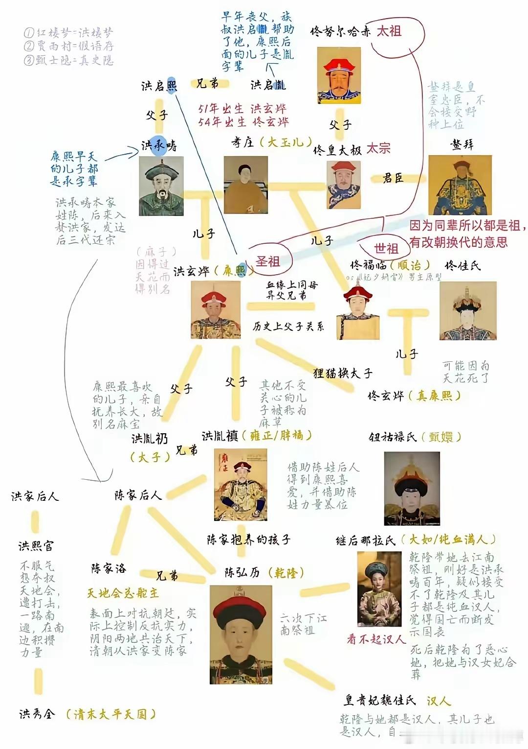 皇太极入关,明朝覆灭,明朝旧臣洪承畴(祖上姓陈,陈姓一支后人躲避祸事改姓洪,汉人)拒降,皇太极的皇后孝庄美人计引诱洪承畴投降,二人有一子(假康熙),皇太极死后儿子顺治继位,顺治有一子(真康熙),少时得天花出宫躲祸,但是死了,孝庄和洪承畴将真康熙顶替,假康熙这是后来的康熙皇帝,继位的时候年少,皇太极朝臣鳌拜觉得是(假康熙)汉人当权,引发叛乱,鹿鼎记中的韦小宝就是陈姓后人(陈、洪两家本是一家,帮假康熙平叛鳌拜)假康熙的儿子雍正皇帝继位,雍正之后是乾隆,乾隆是雍正从陈家里面抱来的一个孩子,这时候洪家不愿意了,本来皇帝的位子姓洪,现在改姓陈了,就有了洪熙官天地会反朝廷的故事,事败南逃就有了南少林,后代出了个洪秀全继续夺权。顺治的儿子真康熙的奶妈姓曹,这件狸猫换太子的事在曹家内部流传下来,后来就有了曹雪芹写红楼梦用秦可卿的事暗讽狸猫换太子的事。乾隆六次下江南是为了祭祖,乾隆带第二个皇后那拉氏祭祖,那拉氏断发示国丧,那拉氏满族人,断发在满族人中表示丧夫,但是乾隆没死,就表示满族人当皇帝断了,现代作家琼瑶(陈家人)、琼瑶表舅金庸都曾在作品中暗示汉人统治满清。