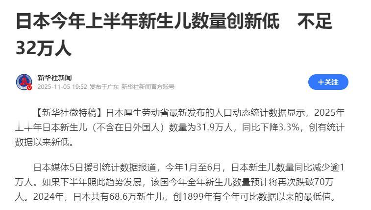 日本传来消息 11月5日,日本厚生劳动省刚公布的人口数据,着实让人揪心!2025年上半年,日本本土新生儿(不含在日外国人)只有31.9万人,同比降了3.3%,创下有统计以来的最低纪录。 这可不是小打小闹的波动,照这个劲儿下去,今年一整年的新生儿数量,怕是要把2024年68.6万的“历史最差”再往下拉一截。要知道,2024年那68.6万,已经是1899年有可比数据以来的谷底了。 更让人犯愁的是,日本人口早就走上了“越跌越狠”的路,根本停不下来。世界银行的数据摆着呢,从2018年的1.268亿人,一路掉到2023年的1.245亿,每年都少几十万。 有机构预测,到2060年,日本人口可能直接少三分之一,最后就剩8700万人。新生儿越来越少,老年人反倒越来越多,日本的人口结构早变成“倒着的金字塔”了,底下的底座越来越小,撑不住上面的压力,风险一眼就能看出来。 那日本年轻人为啥不爱生孩子了?说到底,是连婚都不敢结。法国《费加罗报》的调查特别扎心,现在二十来岁的日本单身男生里,想结婚的比例,从三年前的67.1%跌到了38.7%;女生更不用说,从82.2%降到59%,想结婚、想生孩子的心思,拦都拦不住地往下掉。不是不想谈对象,是钱包不答应啊。 日本明治安田生命的报告说,超过一半的单身女生,都希望未来老公年收入至少400万日元,差不多合人民币25.2万。可二十多岁的日本男生里,能达到这个标准的,也就15.2%。自己挣那点钱刚够糊口,日子过得紧巴巴的,哪敢扛起来一个家的责任? 就算有年轻人咬咬牙结了婚,“生不起、养不起”的现实,也会把生孩子的念头浇得干干净净。日本养个孩子的成本高得吓人,从怀孕到孩子长大成人,各种花销堆下来,普通家庭想都不敢想。 岸田政府急着救场,搞了个叫“异次元少子化对策”的方案,最近刚通过新法案,把福利再扩大点,儿童津贴直接给到18岁的高中生,不管家里收入多少都能领;要是父母一起休育婴假,还能多拿补贴;2026年还要搞“谁都能上幼儿园”的制度,不管爸妈有没有工作,孩子都能进。政府算过,一个孩子从出生到18岁,累计能领146万日元补贴,0到2岁的时候给得最多,平均能拿51万日元。 可这些补贴真能解决问题吗?悬得很。这笔钱不是天上掉下来的,得靠涨医疗保险费凑。到2028年,每个交医保的人每个月平均要多交不到500日元,说白了就是把压力摊到了所有国民身上。 更关键的是,补贴涨的速度,根本赶不上养孩子成本涨的速度。年轻人最愁的那些事儿,工资低、上班压力大、没人帮忙带孩子,这些核心问题压根没解决。好多日本年轻人都吐槽:“与其生了孩子一起遭罪,不如先把自己顾好。” 新生儿一直减少,已经开始拖日本社会的后腿了。劳动力缺口越来越大,工厂招不到工人,养老院缺护工,这些都成了常态,不少行业只能靠招外国劳工来救急。 养老金和医疗体系也快扛不住了,交钱的年轻人越来越少,要养的老年人越来越多,财政上的窟窿只会越捅越大。有经济学家早说了,日本得靠接收移民来补人口的短板,可碍于本土的文化习惯,移民政策一直放不开,没什么进展。 说真的,人口这事儿从来都不是小问题,它藏着一个国家未来的底气。日本现在的困境,也给咱们提了个醒,要让年轻人敢生孩子、愿意生孩子,光靠发点补贴远远不够,得从根上解决就业、买房、孩子上学这些实实在在的难题。 看着日本那不断刷新下限的新生儿数据,真希望这个老龄化严重的国家能早点找到出路,毕竟,一个有活力的社会,从来都少不了孩子的笑声啊。