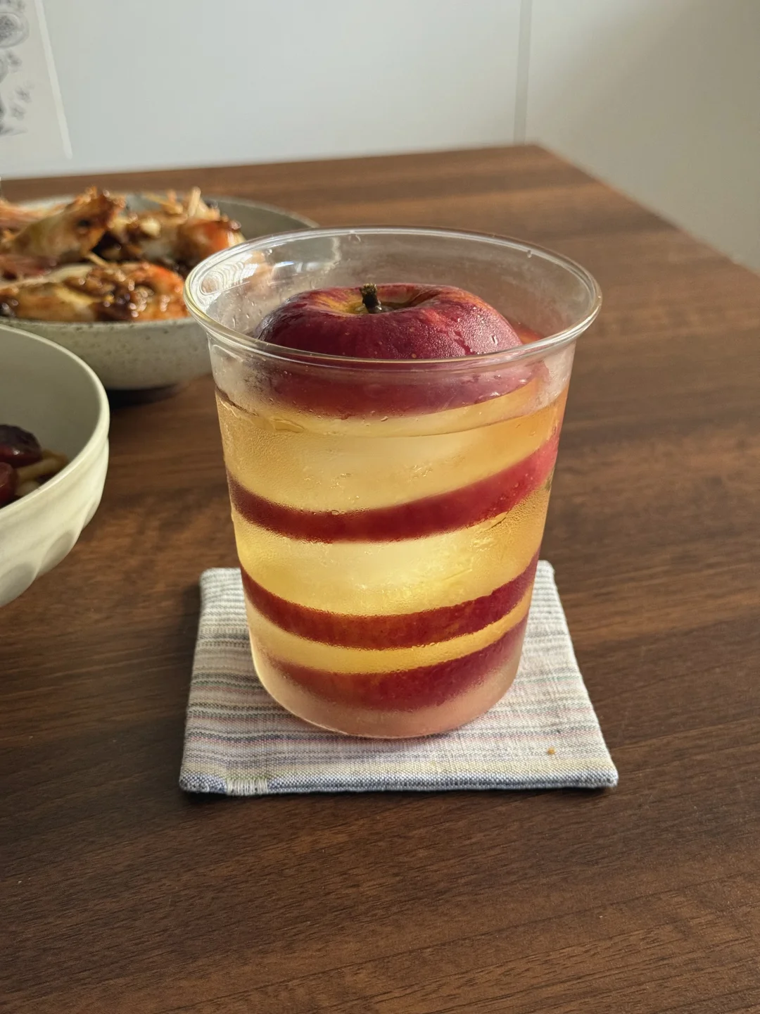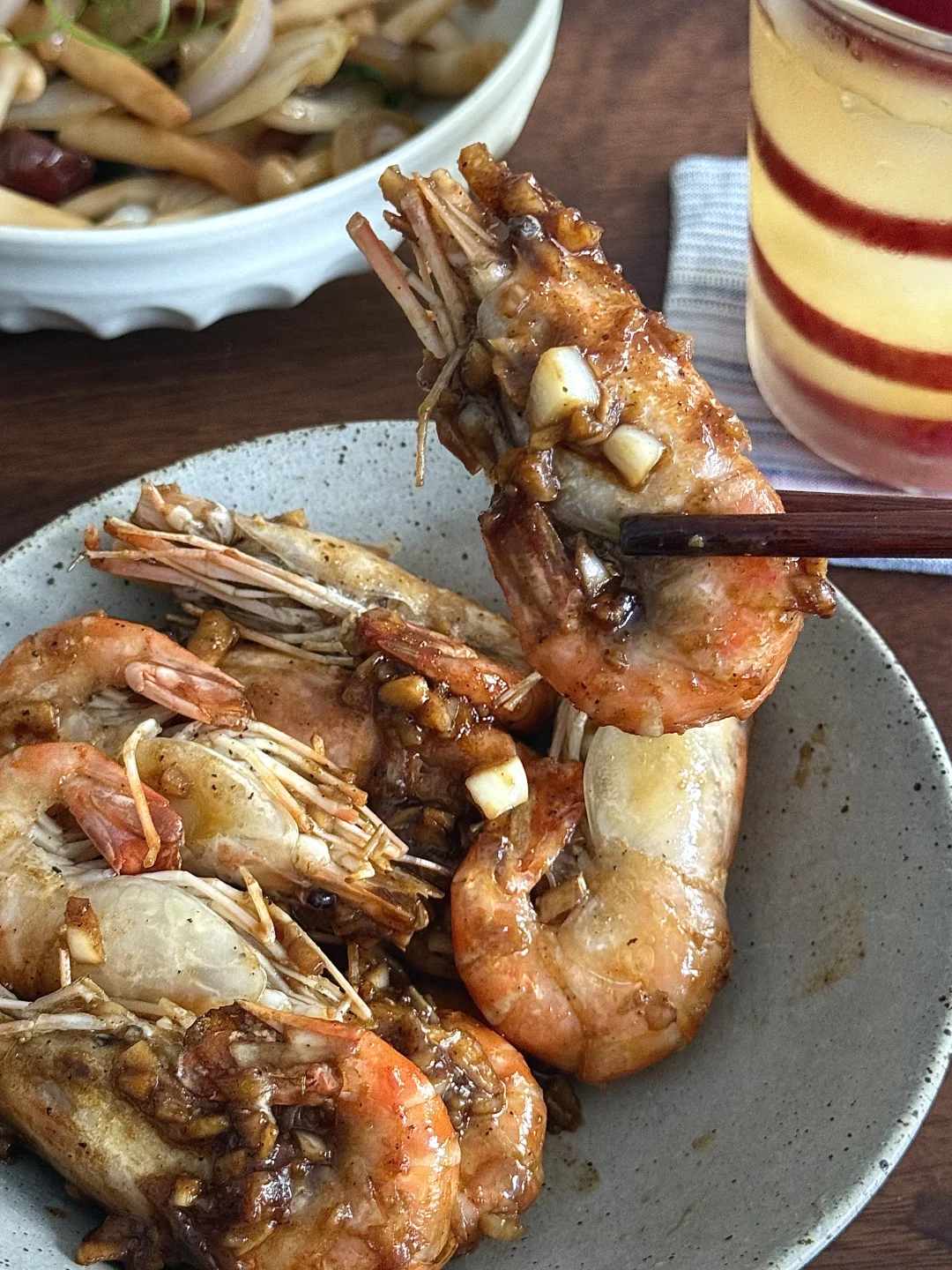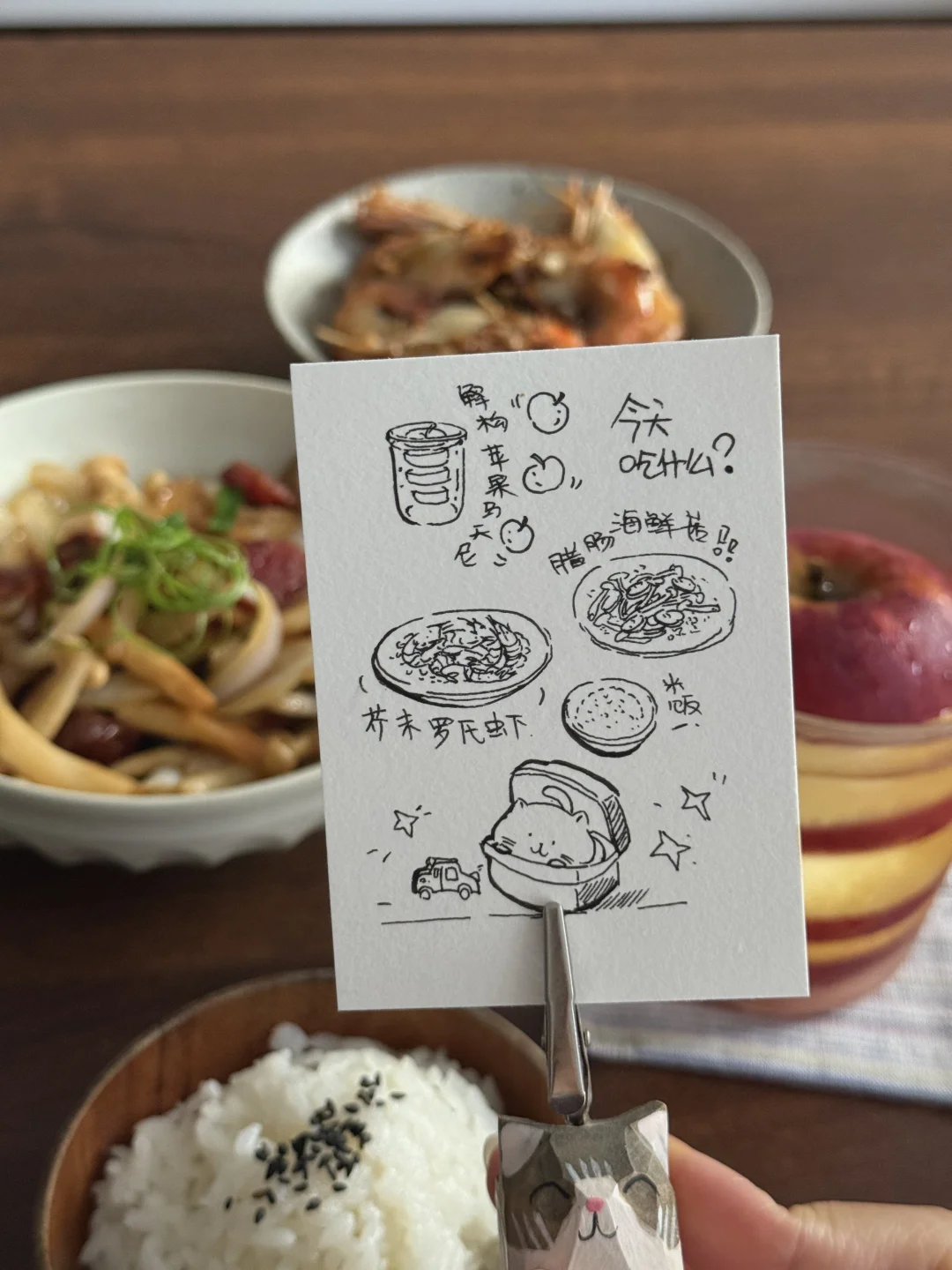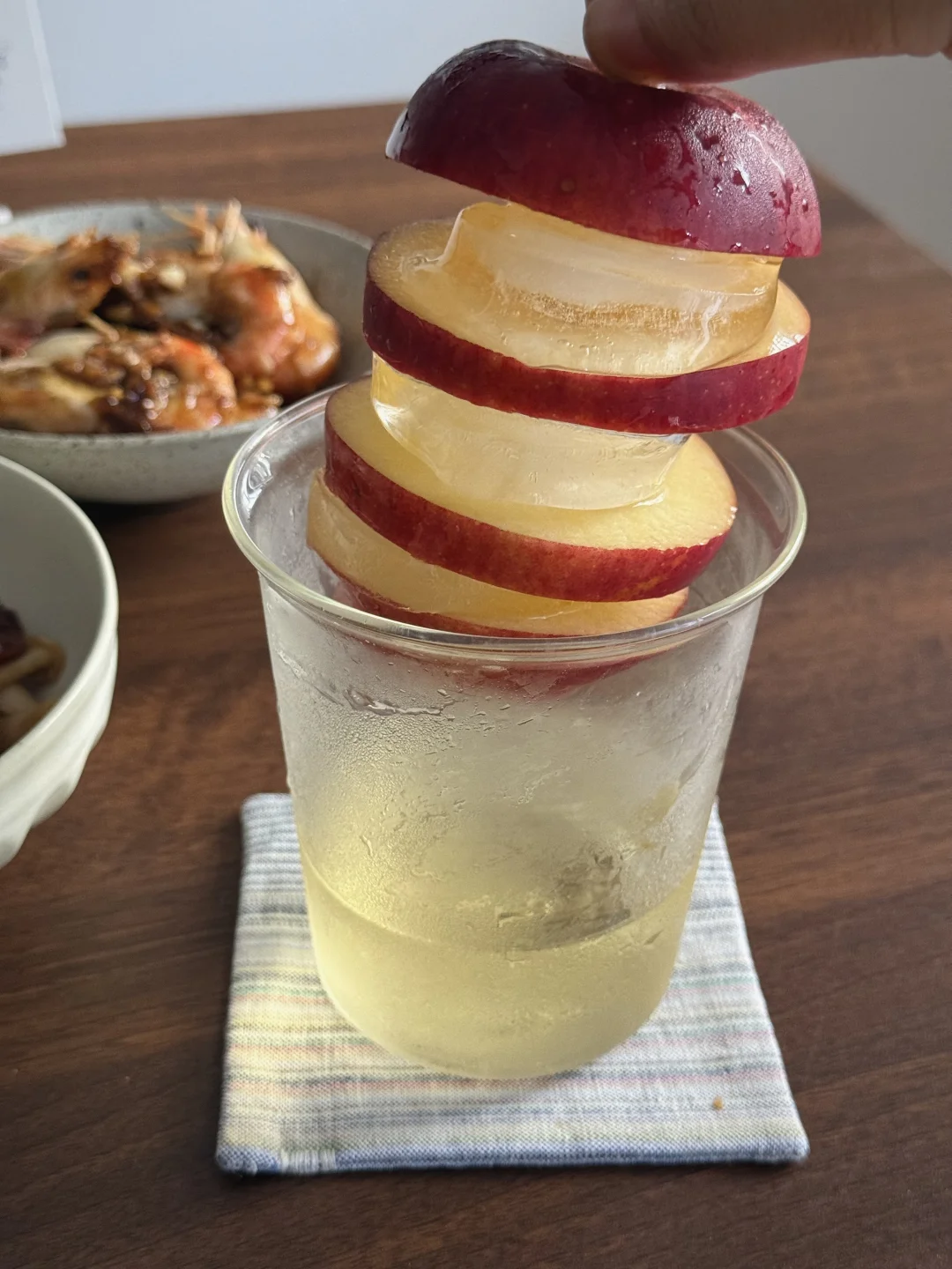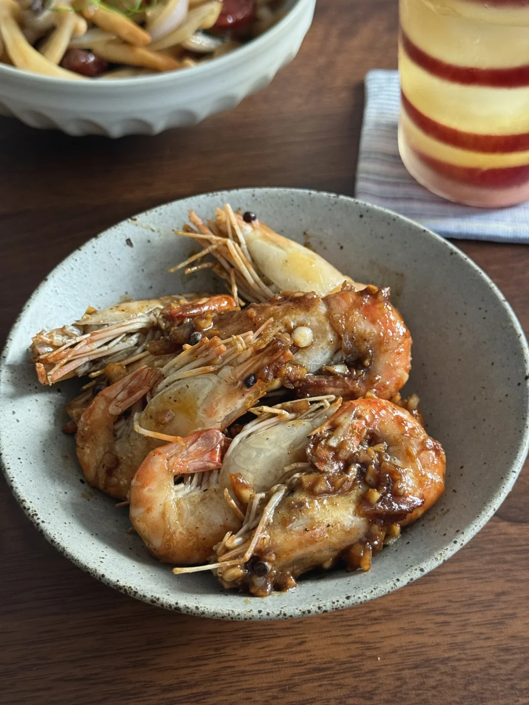 分享漂亮的美食:芥末罗氏虾,菌菇炒腊肠,解构苹果杯,米饭 刚出煎饼主理人,现在又来解构主理人,能试手的怎么少的了我!别人家的小苹果,我来个大大苹果吧😅!看着还挺好玩的! 芥末罗氏虾也好吃,外面先嗦一圈,太香了!我这个虾开了虾背,建议还是不要开虾背了,就和小龙虾抽虾线一个道理……