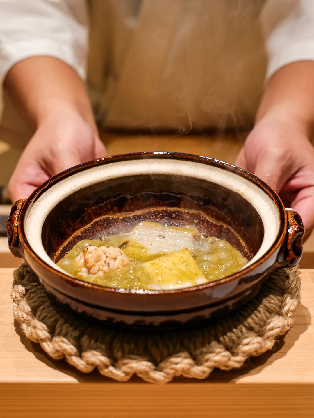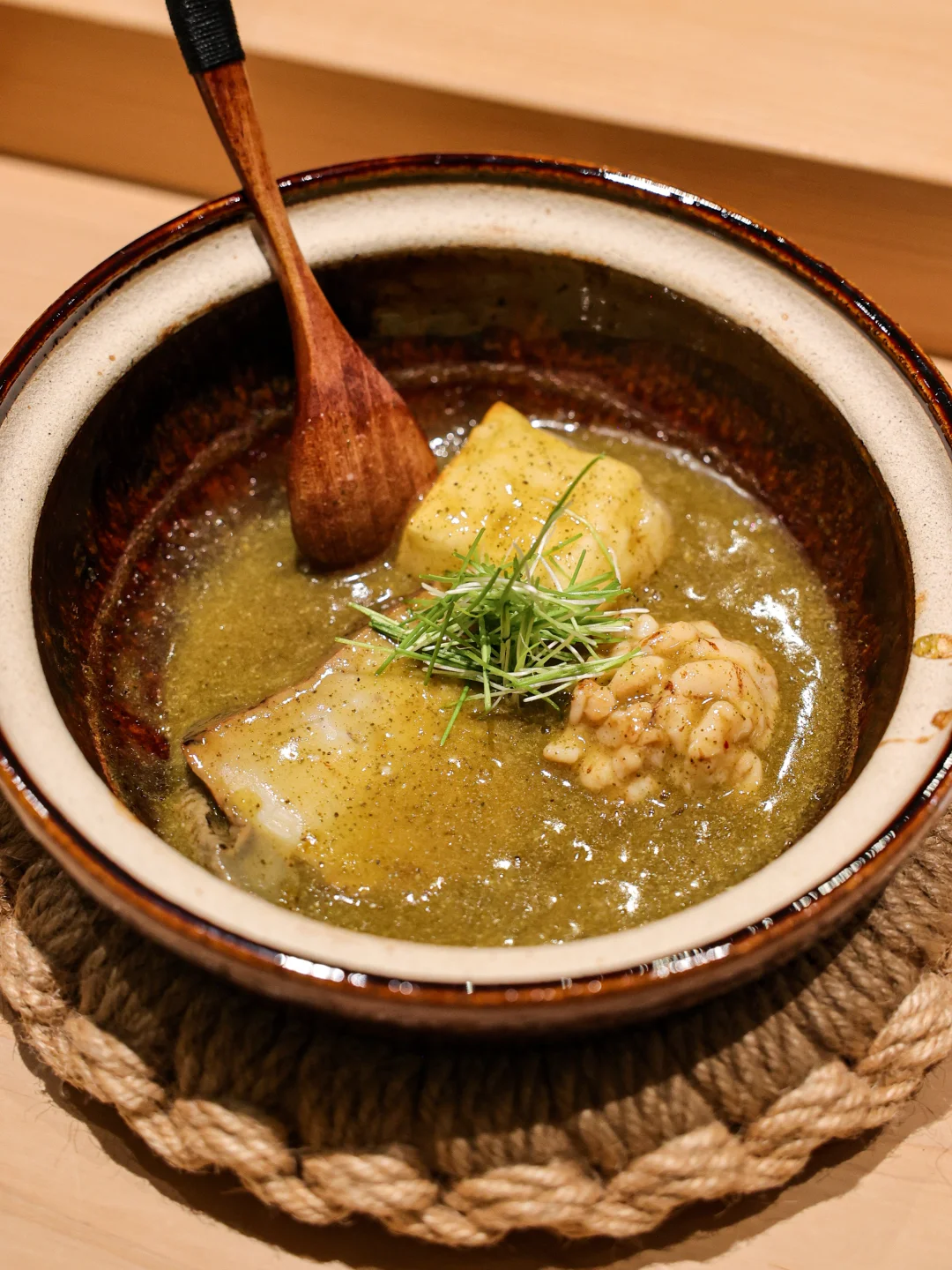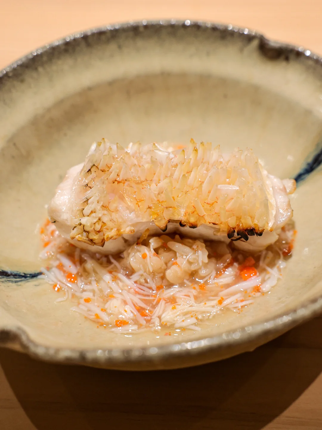 白甘鲷立鳞烧🐟鱼鳞的焦香赋予白甘鲷油香味,鱼肉鲜甜,混合酸味舍利和蟹羹,搅匀后有鲜味、酸味及鱼肉的饱满香气,很完整的一道。