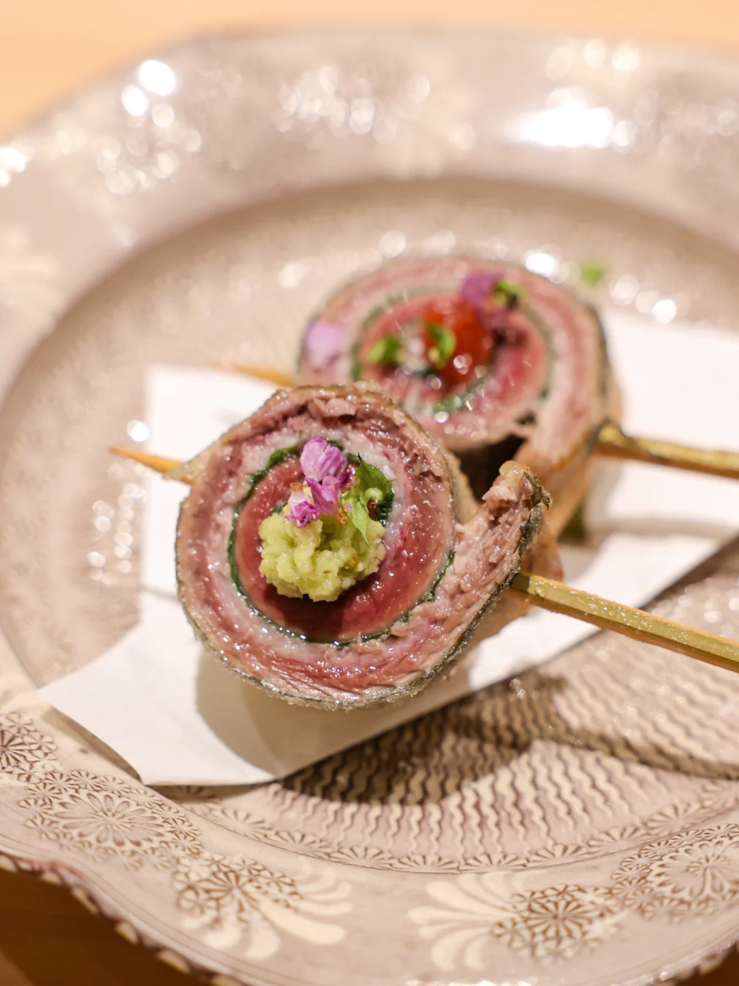 秋刀鱼天妇罗🐟新鲜的秋刀鱼,银皮耀眼;取肉做成卷,天妇罗处理,薄面衣组合鱼肉脂肪,搭配梅子酱、山葵与紫苏花,又有炸物的口感,这道很惊艳!