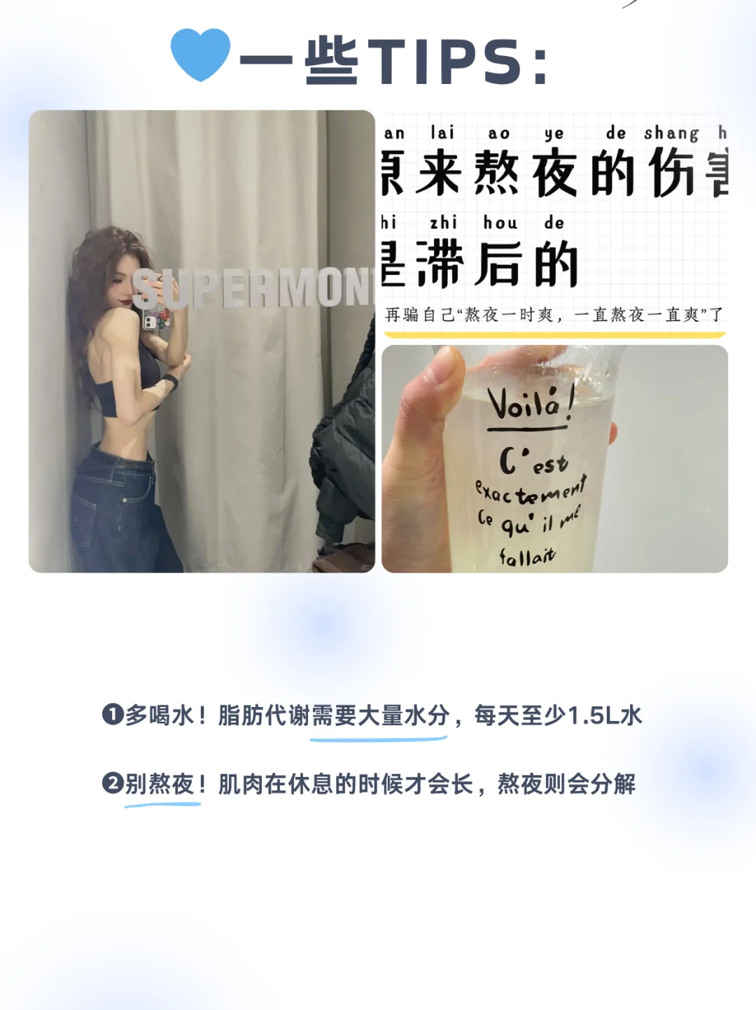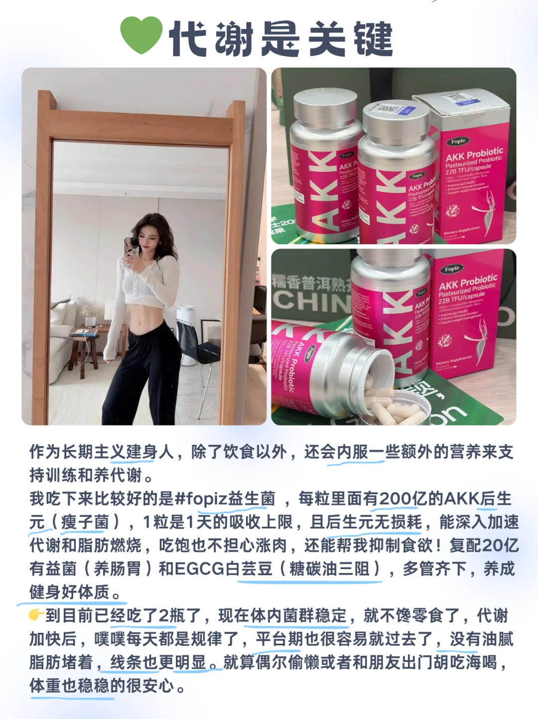 p1、2随手拍,肌肉线条被无数姐妹夸了好多次,也有很多姐妹在下面问我是怎么练出来的? 讲真,我一开始也是懒得动的“林妹妹”,健身后急于求成,训练过度,还节食,把自己弄得营养不良、代谢差、甚至便秘……后面及时调整,饮食+内调代谢双管齐下,到现在跨过了30岁这个坎,反而还看着更加年轻了,肌肉线条越来越清晰,全身没有一丝多余的赘肉。 分享我的好身材思路共勉 - 💛饮食打地基 身材要好,饮食肯定不能少 饮食一定要健康规律,空腹挨饿≠不吃,而是少食多餐,保持7分饱,给脾胃减负,激活细胞翻新延缓衰老 🔸每天2顿饭:每顿饭营养吃足,蔬菜蛋白质碳水各方面都要顾及 早午餐:黑咖+蛋白质,碳水的话我常吃山药南瓜玉米,不容易长肉又饱腹 午晚餐:按2:1:1的比例准备蔬菜:蛋白质:碳水,我习惯跟范志红做水油焖菜,简单掉秤营养 - 💚代谢是关键 无论是减脂还是增肌,代谢都是关键!像30+熬夜、饮食不规律都会让代谢变差,不仅有害菌、垃圾脂肪堆积,还容易脸黄垮垂,肚子上焊游泳圈,大象腿蝴蝶臂,少吃也不瘦,撸铁无精打采… 所以作为长期主义健身人,我还会每天餐后1粒“代谢黑马”AKK菌,这是目前研究最多,专攻【代谢+燃脂+收食欲】的菌种 我吃下来比较好的是fopiz益生菌 ,每粒里面有200亿的AKK后生元,1粒就是1天的吸收上限,且后生元无损耗,能深入加速代谢和燃脂,吃饱也不担心涨肉,还能帮我稳定食欲!复配20亿有益菌(养肠胃)和EGCG白芸豆(糖碳油三阻),多管齐下,养成易瘦体质 👉到目前已经吃了3瓶了,代谢加快后,噗噗每天规律了,没有油腻脂肪堵着,撸铁更有精力,线条也更明显,皮肤都跟着干净通透,素颜细腻光滑了~体内菌群稳定,就不馋零食了,偶尔胡吃海喝,体重也稳稳的很安心。 - 💜合理安排训练 我是一周五练,前后热身拉伸+1h无氧+30min有氧,消耗700千卡,真的感觉身体和脸蛋都是紧的~ ◼腹部:帕梅拉20min上下腹部训练、卷腹 ◼练背:杠铃划船、高位下拉、坐姿划船 ◼臀腿:臀推、臀桥、保加利亚单腿蹲 ◼手臂:自重引体、半程硬拉、哑铃 ◼有氧:空腹爬坡,坡度20速度5 见人不如健身健身减脂fopiz益生菌AKK菌运动益生菌变美