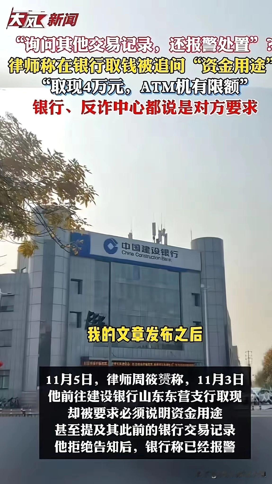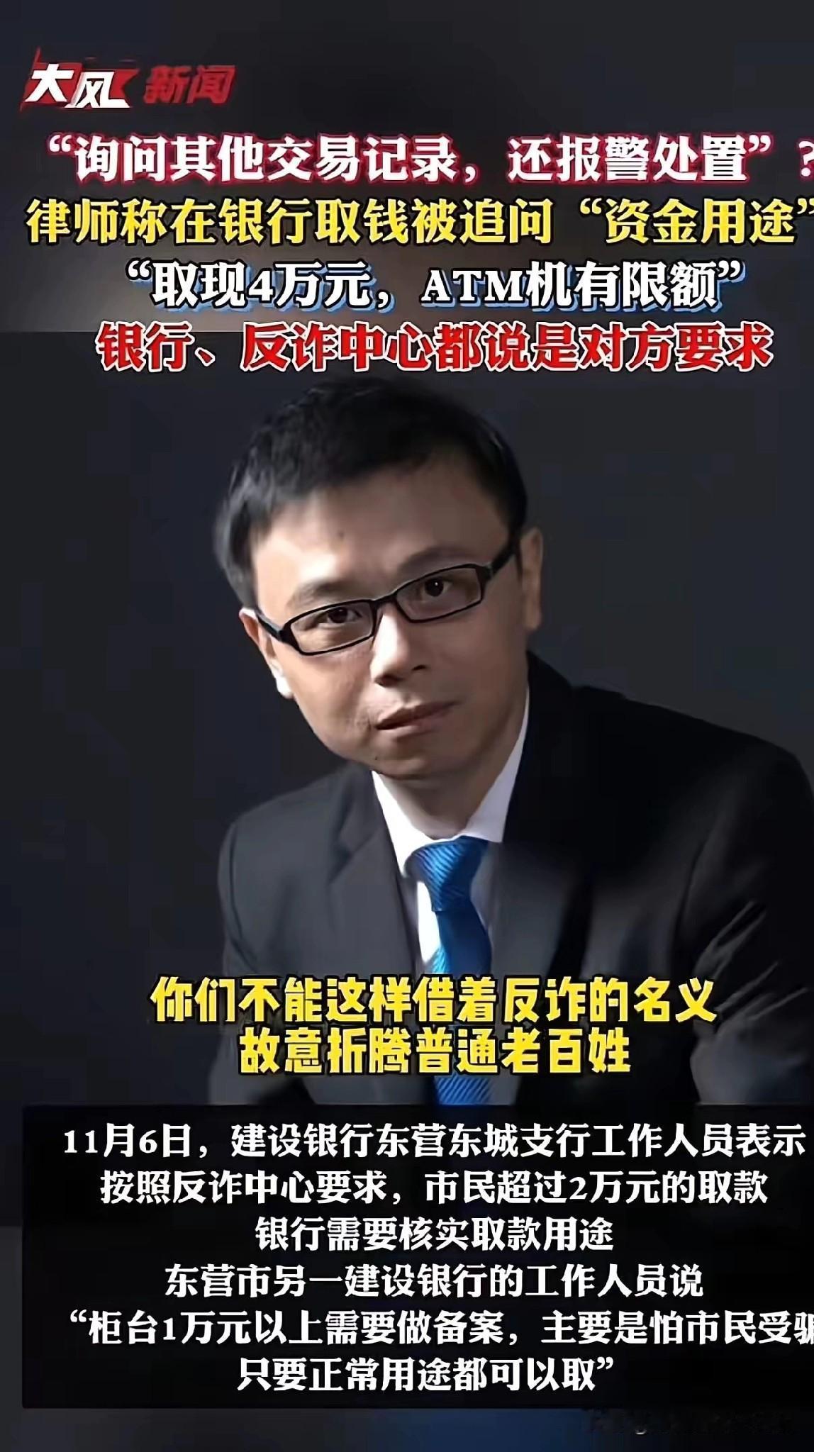 “银行这次碰到硬茬了!”山东东营,律师去银行取4万现金,被追问“资金用途”,律师认为这侵犯自己的隐私权,拒绝告知,银行竟然报案处置!律师这下忍不了,把这事情发到了网上,银行领导低头道歉,但律师觉得事情还没完…… 这事儿说起来挺有意思,一个懂法的专业人士去取自己的钱,反而被要求“自证清白”。周筱赟律师取款时遇到的连环追问,早已超出常规业务办理的需要。“具体是买什么?”这种问题简直像在审案子,更夸张的是银行柜员竟然翻起旧账,追问起上个月某笔转账的来龙去脉。银行把每个储户都当成潜在犯罪嫌疑人来对待,这完全颠倒了一般社会规则——正常情况下,应该是谁主张谁举证,银行觉得可疑,得自己拿出证据来。 反诈本是好事,可如今一些地方执行起来完全走样。东营市反诈中心嘴上说没有金额标准,银行却死守着“1万元以上必须说明用途”的土政策。更讽刺的是,央行等三部门今年8月刚发布的征求意见稿,明明取消了过去5万元以上需登记资金来源的要求。国家层面在给老百姓“减负”,基层却在不断“加码”,这种反差让人哭笑不得。 银行和反诈中心互相“踢皮球”的场面更是让人大开眼界。银行口口声声说是反诈中心的要求,反诈中心却轻描淡写地说这是“银行自己的问题”。两边说辞对不上,老百姓被夹在中间无所适从。这种责任模糊地带,最终吃亏的还是普通用户。想简单取个钱,还得先琢磨清楚当地银行的“隐形规定”。 类似情况还真不少见,江西南昌等地之前出现过办电话卡要“无犯罪证明”的荒唐事。以安全之名行侵权之实,这种风气可不能惯着。保护资金安全很重要,但不能用牺牲公民基本权利当代价。银行柜员随口一问看似简单,背后却是每个人最核心的隐私权和人格尊严。 这事儿最值得玩味的是律师的坚持。银行领导出面道歉后,普通人可能就顺势下台阶了,但周律师明确表示“不接受道歉”。他较真的不是个人委屈,而是这种普遍存在的不合理现象。如果没有较真的人站出来,类似情况还会继续发生在我们每个人身上。 从法律角度看,今年8月的新规征求意见稿已经释放出明确信号:金融监管正朝着更加尊重个人信息自主决定权的方向发展。金融机构确实需要履行反洗钱等法定义务,但必须遵循“最少必需”原则,不能漫无边界地收集和使用个人信息。如何在保护金融安全的同时守住公民权利的底线,需要更多这样的公开讨论和监督。 各位读者你们怎么看?欢迎在评论区讨论。
