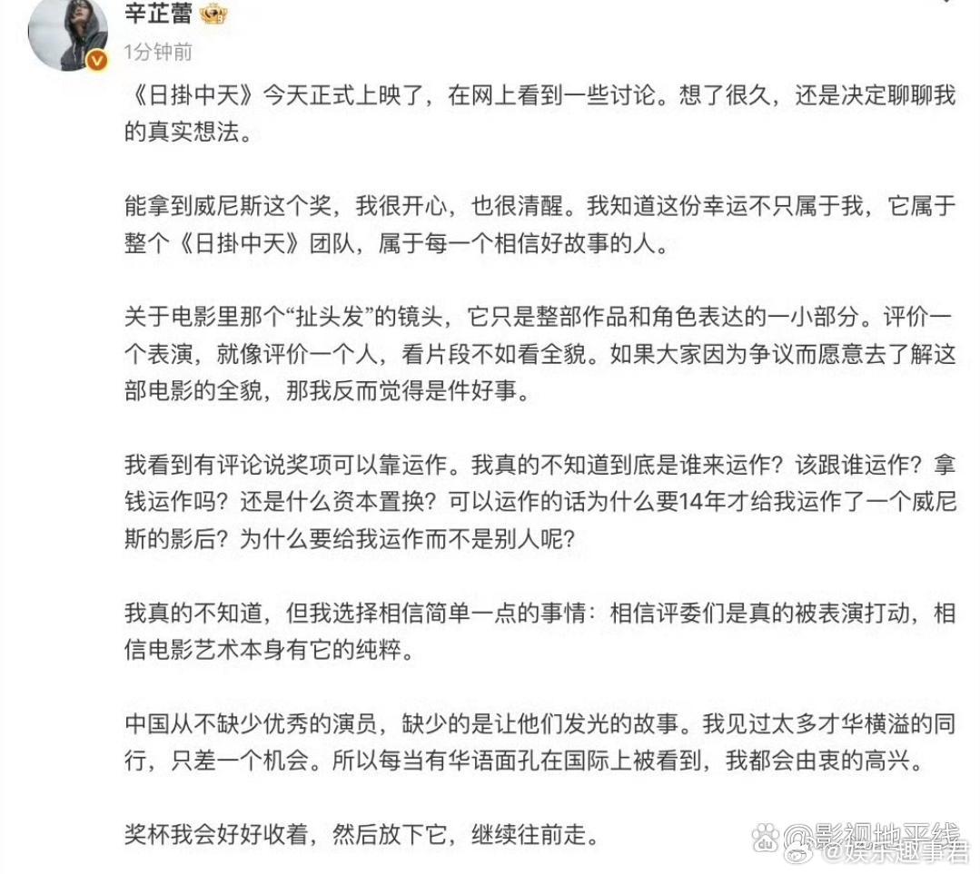 辛芷蕾6连问辛芷蕾特意发文谈了自己的获奖心路历程,并暗示自己的奖项并不是靠运作得来的。