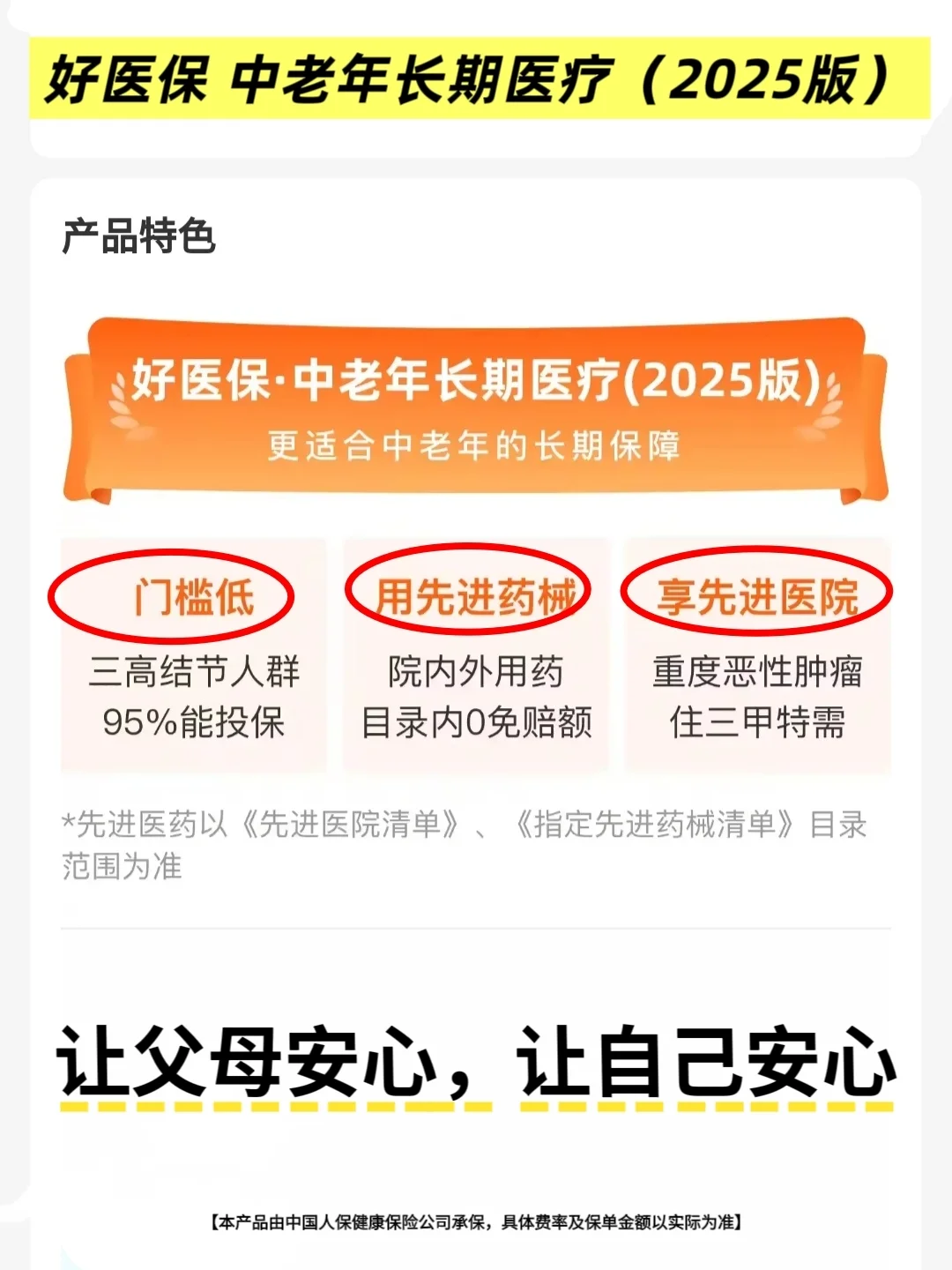 400万高保额,中老年常见大小病住院都能报。全目录800多种进口药、400多种原研药等共1500余种先进药械0免赔额+100%比例报销,比如癌症等大病用的CAR-T抗癌针、靶向药,骨折、高血压等小病住院能用的进口降压药(拜新同)、甚至奥司他韦,都是花1块钱全报!这样就更有底气在父母住院时敢用药、用好药,也不用担心一场大病会掏空积蓄导致一夜返贫