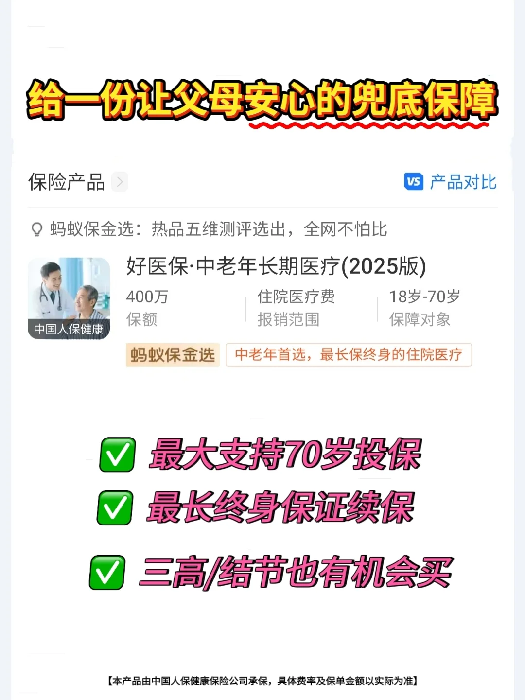 在做功课了解相关知识后,我找到了这款【好医保·中老年长期医疗(2025版)】,这是一个针对中老年人群非常友好的医疗保险