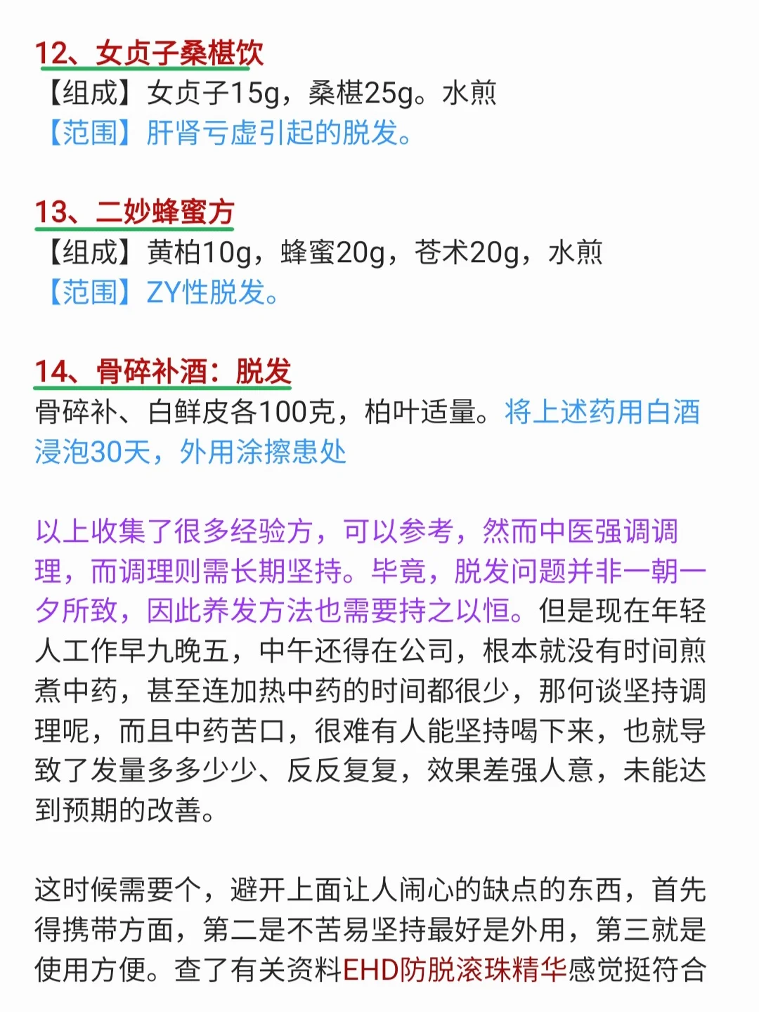 为了寻找有效的解决办法,都尝试了多种方案,包括中药调理,但其苦涩的味道让人难以接受,加之每天早九晚五,中午还得在公司,根本就没有时间煎煮中药,甚至连加热中药的时间都很少,那何谈坚持调理呢,而且中药苦口,很难有人能坚持喝下来,也就导致了发量多多少少、反反复复,效果差强人意,未能达到预期的改善。