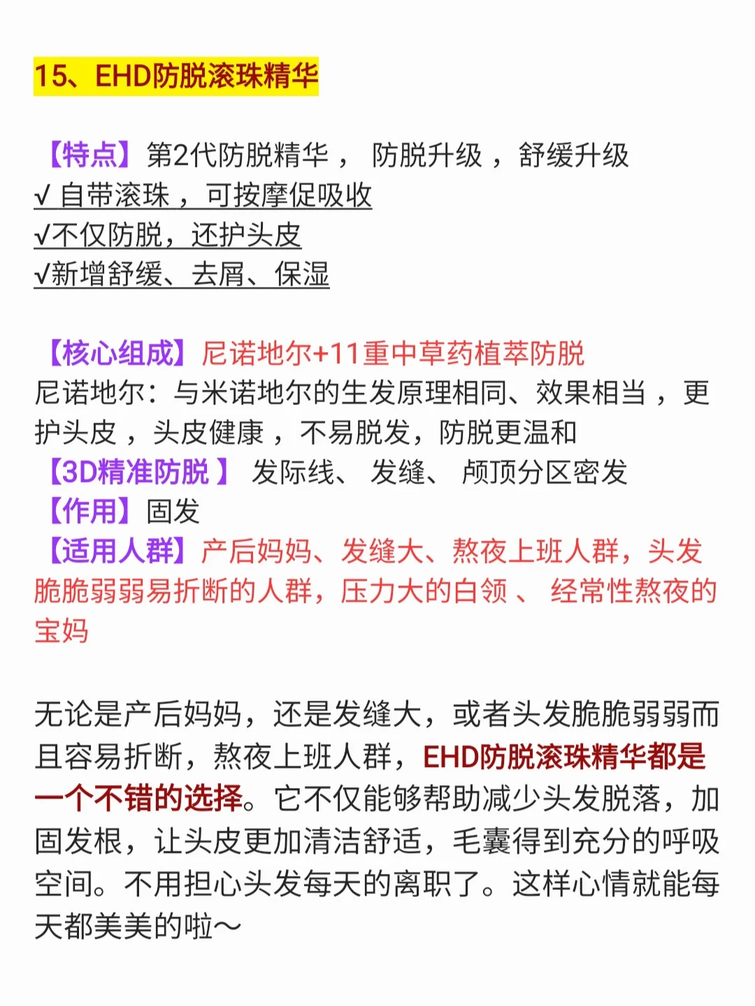 无论是产后妈妈,还是发缝大,或者头发脆脆弱弱而且容易折断,熬夜上班人群,EHD防脱滚珠精华都是一个不错的选择。帮助减少头发脱落,加固发根,让头皮更加清洁舒适。不用担心头发每天的离职了。这样心情就能每天都美美的啦~