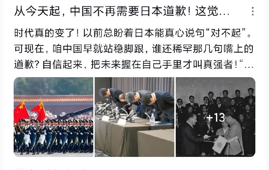 咱们中国没必要再等日本的道歉了?这背后,可是沉甸甸压着3500万亡魂的重量啊!从村山富市到安倍晋三,日本那些政客的“表演式道歉”,早就看得我们心里发腻了。 嘴上说着“深刻反省”,转头就悄悄篡改教科书;这边刚鞠躬道歉,那边又跑去参拜靖国神社。这种又当又立的操作,一搞就是30多年,我们早就看透了。毕竟,历史不是任人打扮的小姑娘,3500万同胞的血和泪,谁能轻飘飘一句“对不起”就抹去? 2010年的钓鱼岛事件,就是个大转折点。从那以后,咱们的海警船开始常态化在附近海域巡航,咱们的新能源车出口量也反超了日本,北斗卫星更是成功全球组网,一步步把“卡脖子”的技术变成了自己的底气。 当实力真正成了硬道理,谁还会在乎那些虚情假意的道歉呢?设立国家公祭日那天,南京城的警报声里藏着真正的答案:铭记历史不是为了记恨,而是为了让那样的悲剧再也不会发生。现在的年轻人,更关注的是咱们的科技又突破了哪些新领域,这种实实在在的底气,比一万句“对不起”都要珍贵得多。 (你见过日本篡改后的历史课本长什么样吗?)