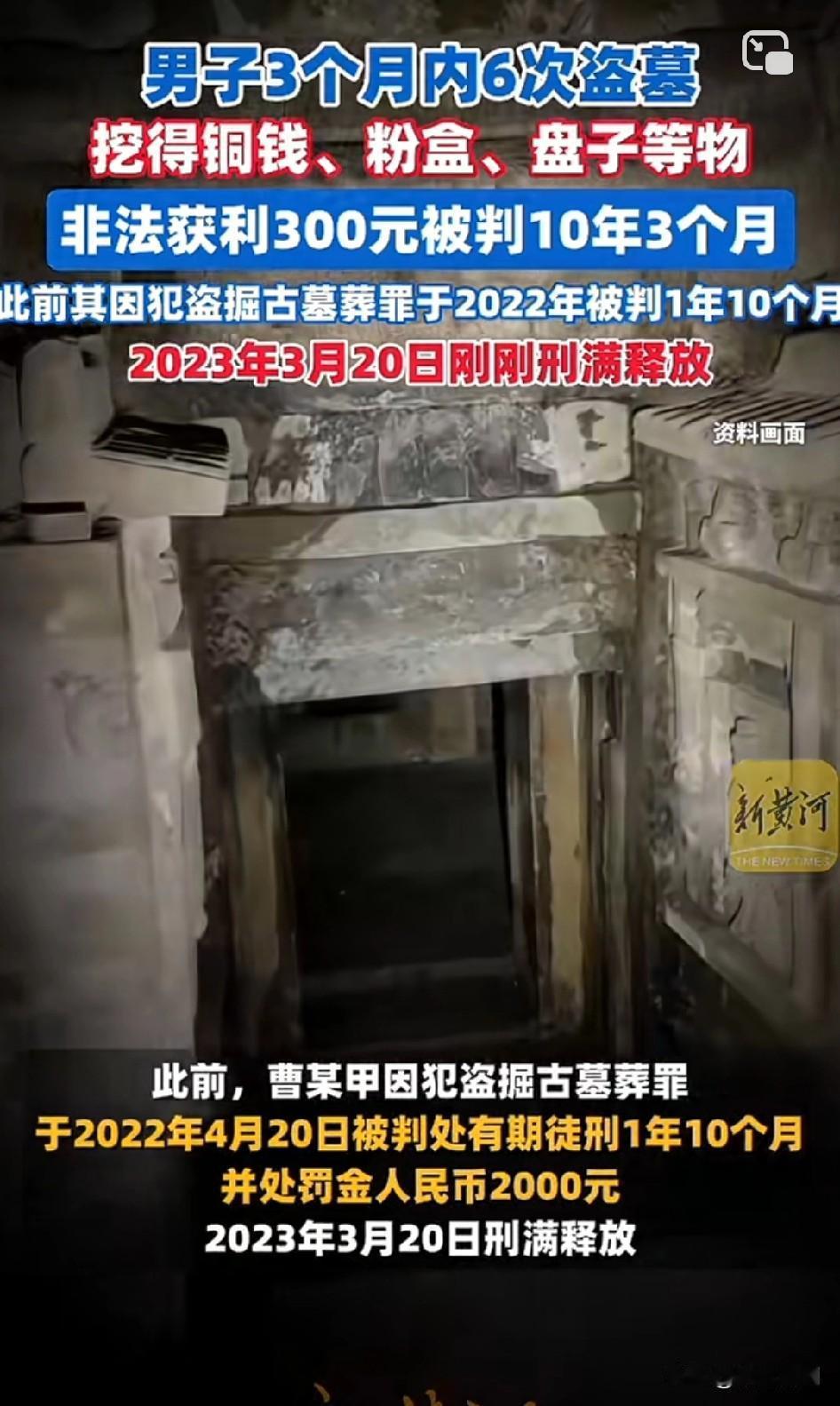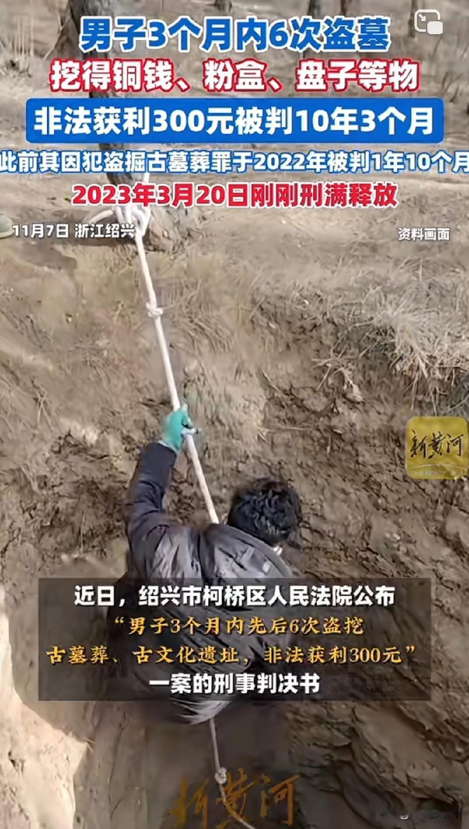 史上最惨盗墓贼获利300元被判10年 近日,浙江绍兴的奇闻异事,男子3个月内6次盗墓,挖得铜钱、粉盒、盘子等物,非法获利300元被判10年3个月! 此前22年盗墓被判了一年多,23年出狱,以后又开始先后6次进出古墓,这是个倔种,因为他一共才卖了300元,说明不值钱,就这还被罚款10000元,没收300元非法所得![捂脸] 为了以示惩戒,对二次犯罪者重罚特罚。