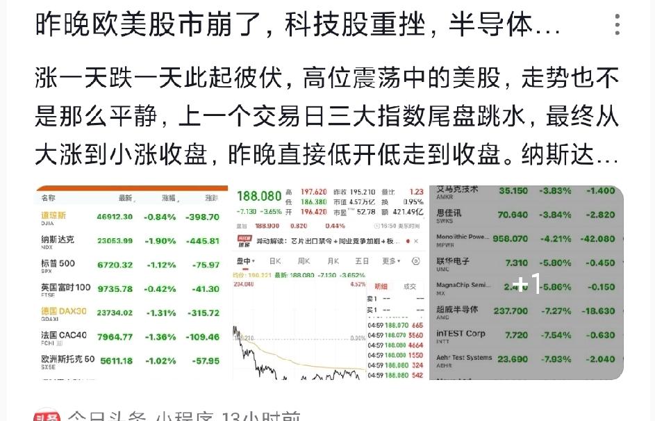 昨晚欧美股市集体大跌,科技股跌得惨不忍睹,半导体板块直接领跌!英伟达连续跌了整整七天,特斯拉一天功夫就跌回了之前水平,欧洲三大股指尾盘集体上演“高台跳水”的戏码。 但咱们这儿的股市却走出了不一样的走势!三大指数低开之后一路往上走还放量大涨,成交量直接突破了2.1万亿,大盘成功站稳了4000点。中概股在这样的行情下反而红了,小鹏汽车暴涨了快10%,百度和阿里也一起跟着涨了起来。 这波操作让股民们都觉得有点懵:全球市场一片绿,咱们这儿却红得亮眼,这到底是为啥?有专家说可能是科技股轮动补涨的结果,也有散户们开玩笑说“外面跌咱们涨,这才是咱们独有的行情嘛”。不过得提醒一句,半导体和新能源车板块可能短期会有点调整压力。 各位老铁觉得,这波独立行情能持续多久?是昙花一现还是慢牛要来了?想知道答案的老铁,快来评论区聊聊你的想法!