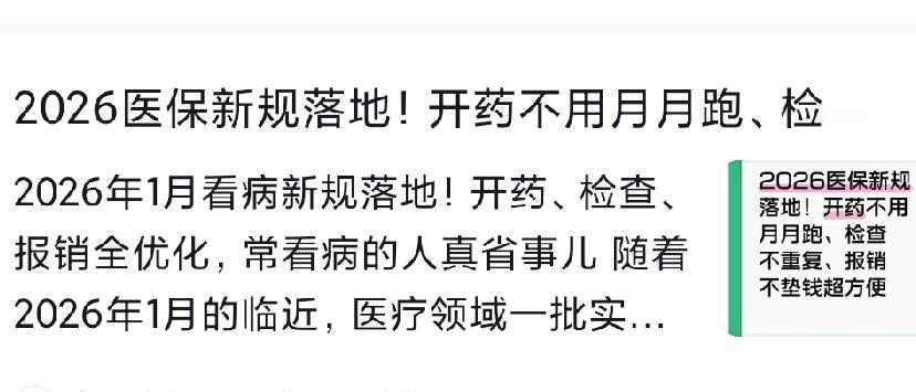 2026年1月起,去医院看病能少花不少冤枉钱!慢性病开药、检查结果互认、异地报销,这三大新规正式实施,对咱们老年人来说真是个大福音,以后看病不用频繁跑腿啦。 就说隔壁张大爷吧,以前每个月都得往医院跑好几趟开降压药,子女还得专门请假陪着,时间长了都成了常事。这次新规实施后,要是病情稳定的慢性病患者,就能一次性开够三个月的药,不过可别忘了带上病历本和最近的检查单子。咱们来算算:像独居的张大爷这样的老人,一年下来能少跑医院8次,光打车的钱就能省好几百块。 更贴心的是,同城的医院做的检查结果,30天内都是互相认可的。就像上周李阿姨在市中心医院做了个CT检查,转院去别的医院时,她掏出手机点开电子报告,直接就不用再重复做检查,省了500块的冤枉钱。记个小窍门:主动跟医生说“医生,这检查我三天前在XX医院做过”,只要符合条件,医院就必须认这个结果。 异地看病报销也更方便了。提前在医保相关的APP上办理备案手续,到了门诊直接用手机刷码就能结算,再也不用自己先垫钱、再跑腿交各种材料。不过有几个事儿得记牢:医保别断缴,电子凭证也得提前激活好,社区医院做的检查暂时还不能互认哦。这些新规要是用对了,看病真能省不少心,用错了可就可能白跑一趟了。你们当地的医院开始执行这些新规了吗?还没去医院的朋友快看看,能省的钱可别错过了!