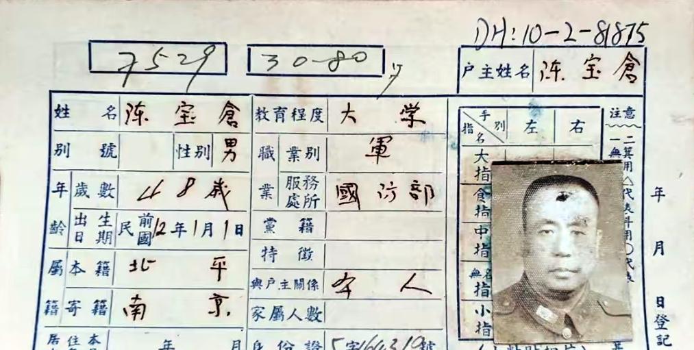 这是陈宝仓将军填写的户籍卡。户籍卡上有陈宝仓将军的照片与基本信息。陈宝仓将军在教育程度一栏中填写的是大学。陈宝仓将军曾是保定陆军军校的高材生,各门功课成绩优秀,连年获奖。相对于吴石将军在这一栏填写的陆大,陈宝仓将军简单写上大学。 当时,陈宝仓将军48岁。职业中服务处所为国防部,职别为军。当年,吴石将军也在职别这一小栏中写了军,但又被他划去,重写了局长二字。因为,当时吴石将军担任国防部史料局局长。 陈宝仓将军籍贯河北遵化,出生北京。他在属籍中的本籍栏中填写北平,当时北京称为北平。但陈宝仓在南京任职,所以在寄籍栏中填写南京。当时,陈宝仓将军住在丰富路342号。
