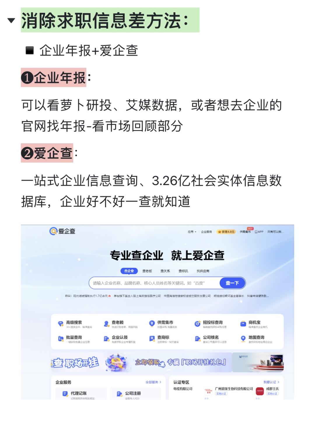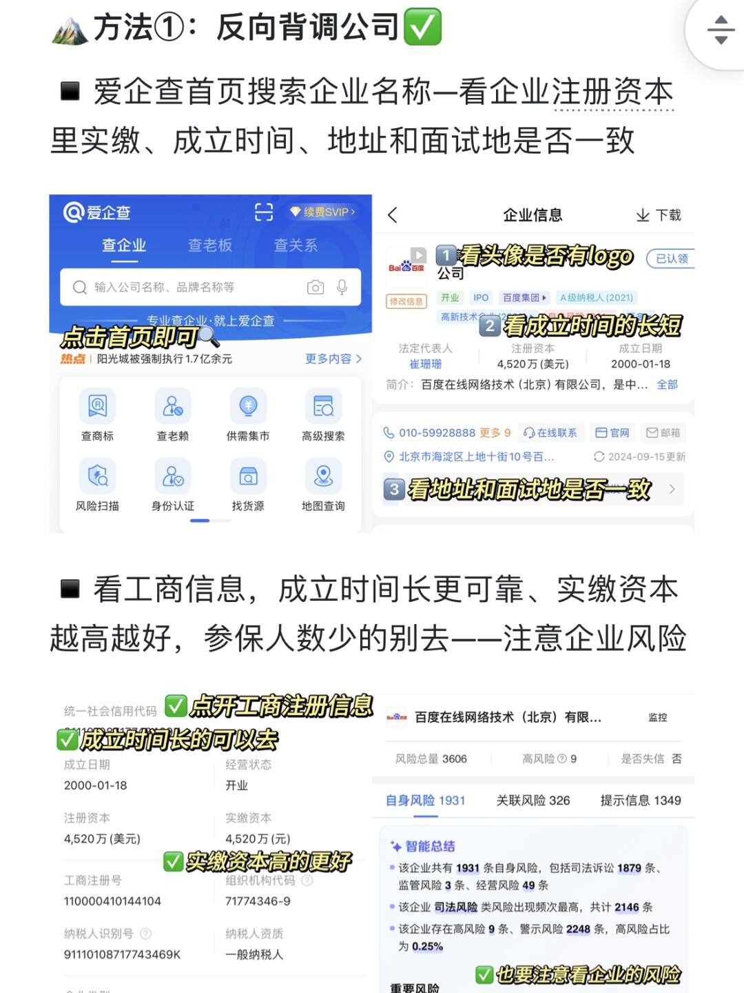 ▪️方法①:反向背调公司,求职不知道企业是否可靠,爱企查首页搜索企业名—看企业注册资本里实缴、成立时间、地址和面试地是否一致——看工商信息,时间长更可靠、实缴资本越高越好,参保人少别去——注意企业风险