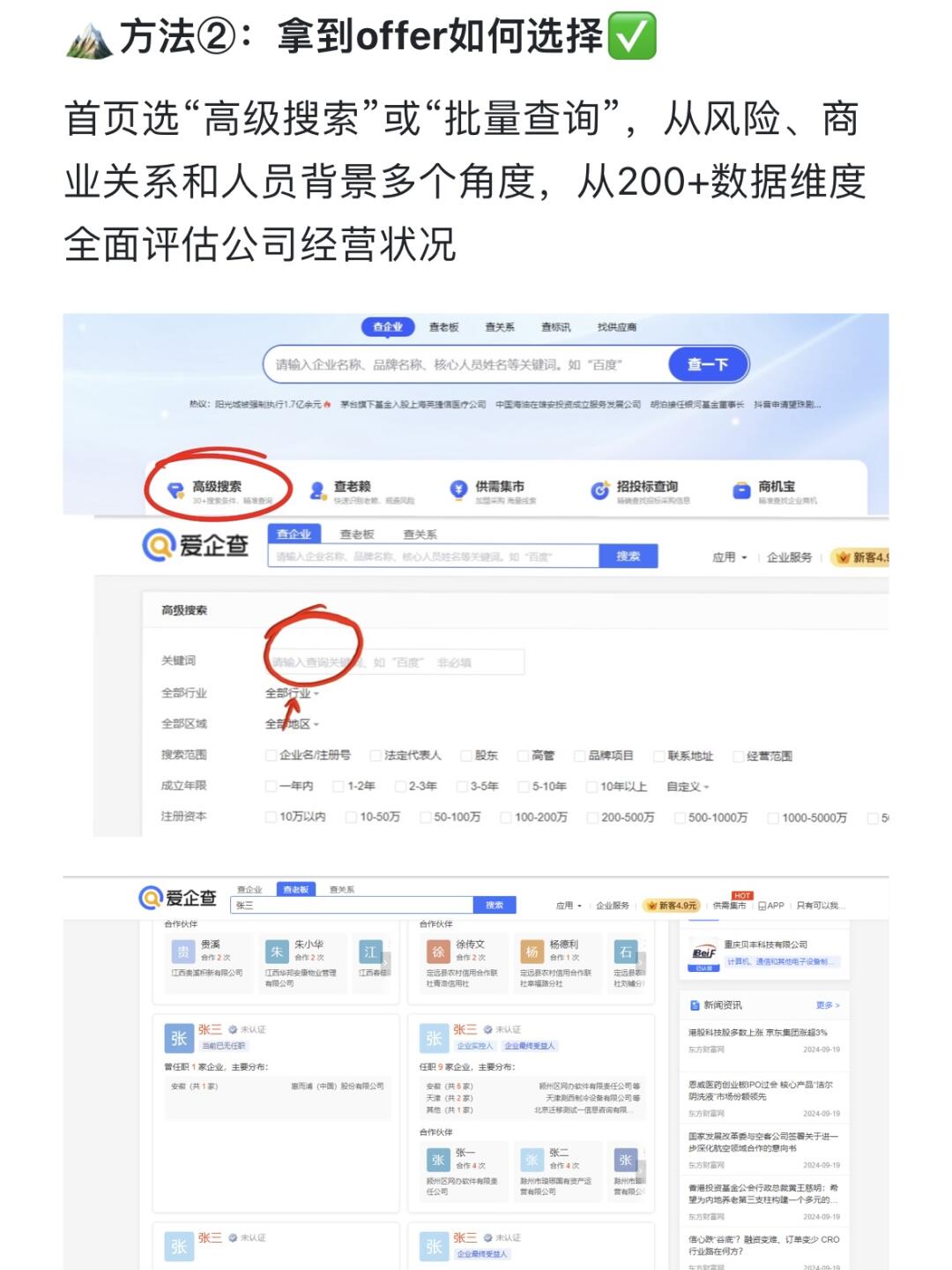▪️方法②:拿到offer不知如何选择,首页选“高级搜索”或“批量查询”,从风险、商业关系和人员背景多角度,从200+数据维度评估公司经营状况