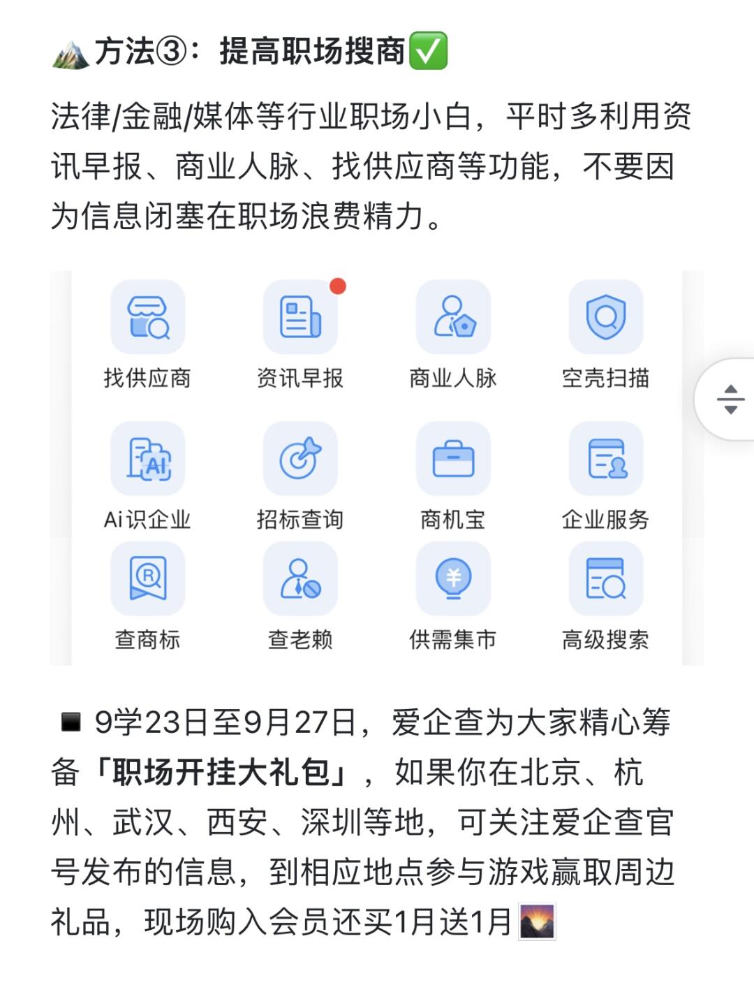 ▪️另外,9月23至27日,爱企查推出「职场开挂大礼包」,base北京、杭州等地多关注官号信息,参与游戏赢周边礼品,现场入会还买1月送1月