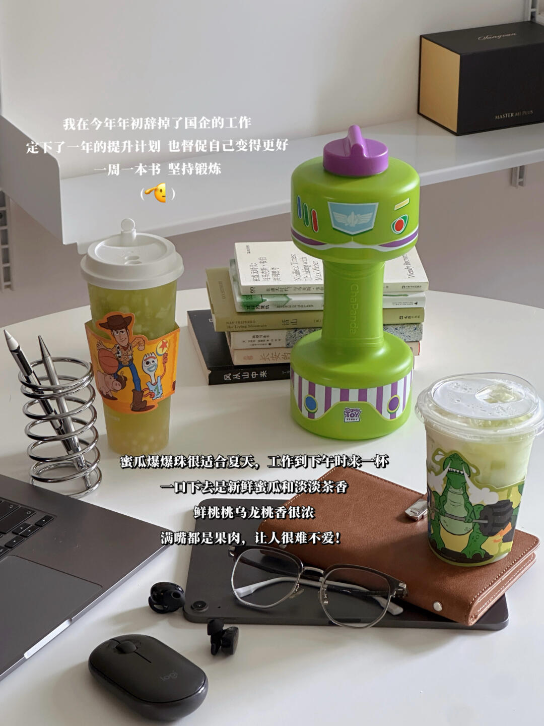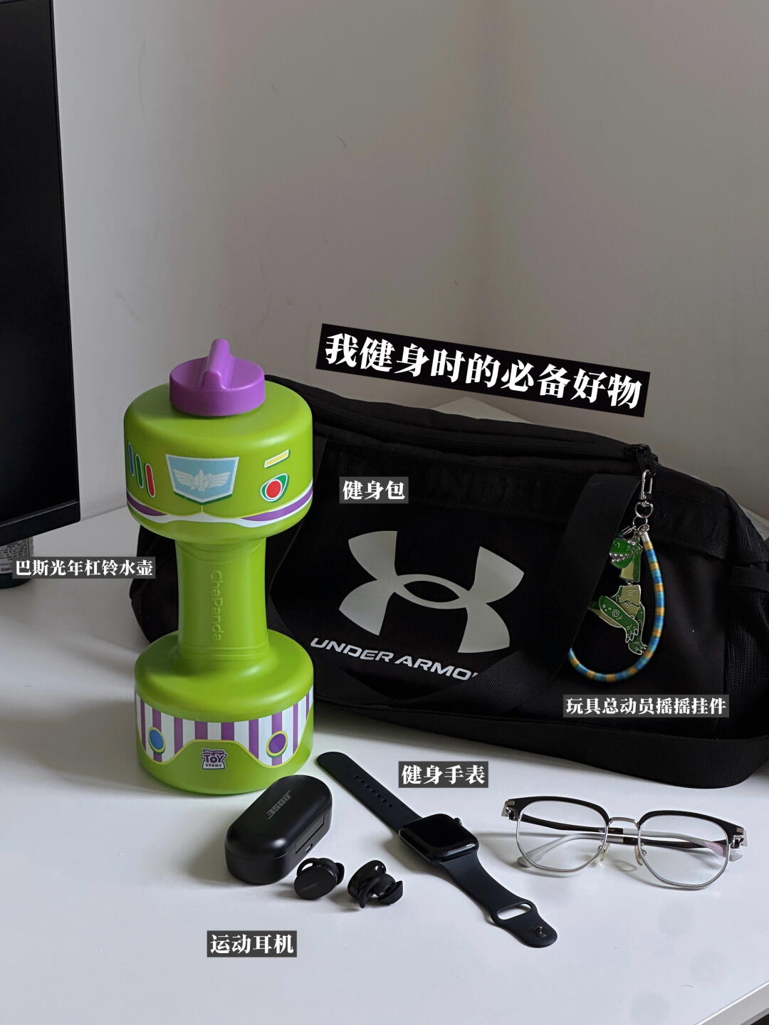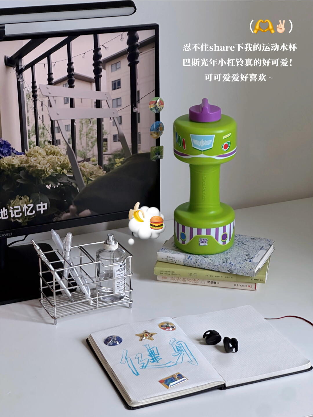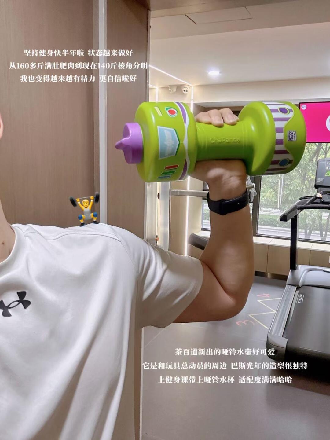我发现能够坚持健身的方法是,融入日常。除了私教课,办公室久坐时,我也会找机会活动身体。每工作1小时,我就把茶百道新出的哑铃水壶用起来,它是和玩具总动员的合作,巴斯光年造型独特,灌满水后就是我现成的“小哑铃”🏋🏻♂️