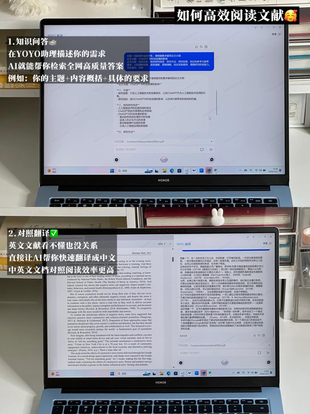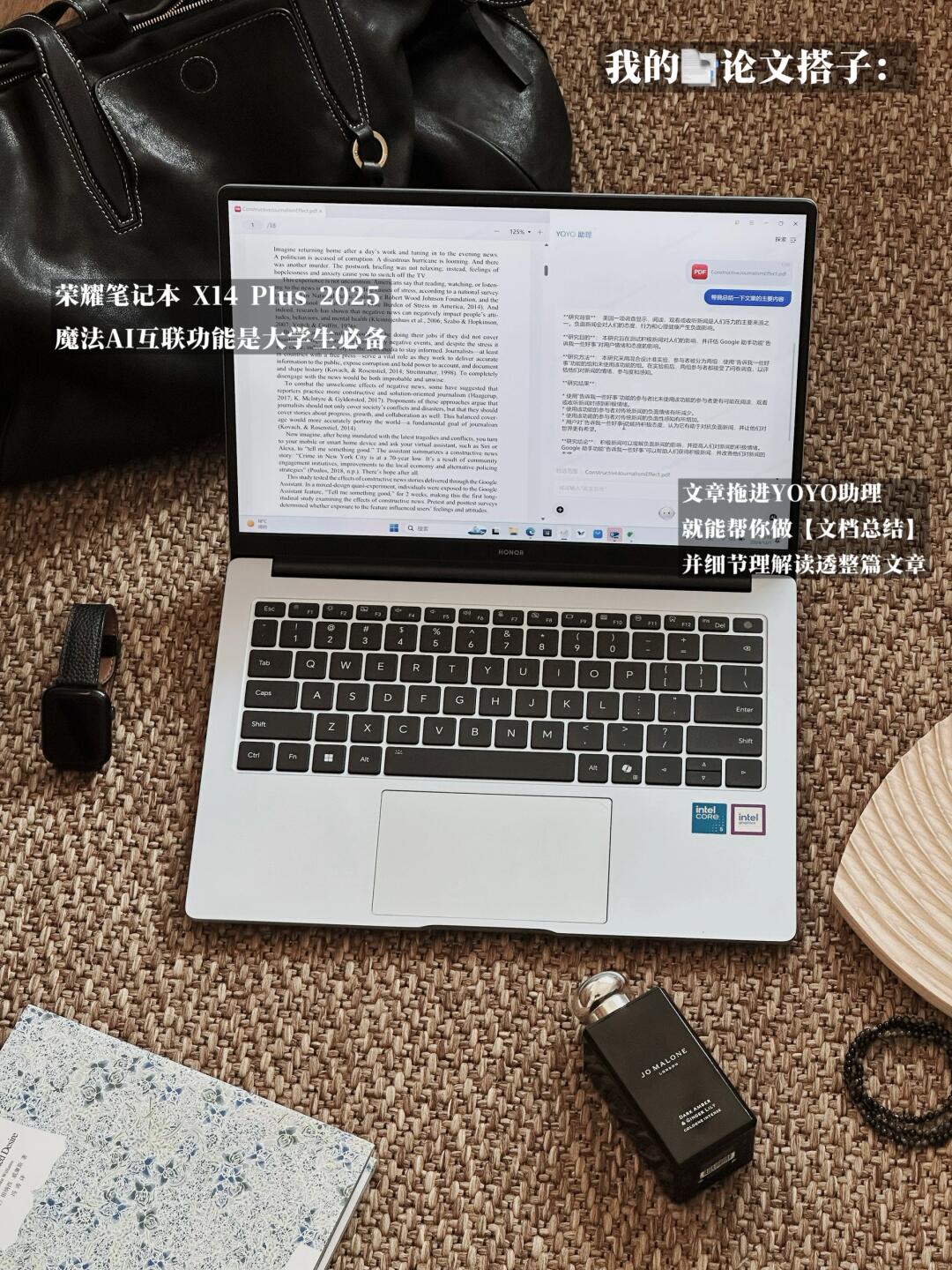 荣耀笔记本 X14 Plus 2025,魔法AI互联功能简直大学生科研必备,学霸AIPC方法是先用【知识问答】检索高质量文献,再用【文档总结】功能做纪要总结读透论文。看英文文献让AI帮你翻译,中英文档对比提高学术效率
