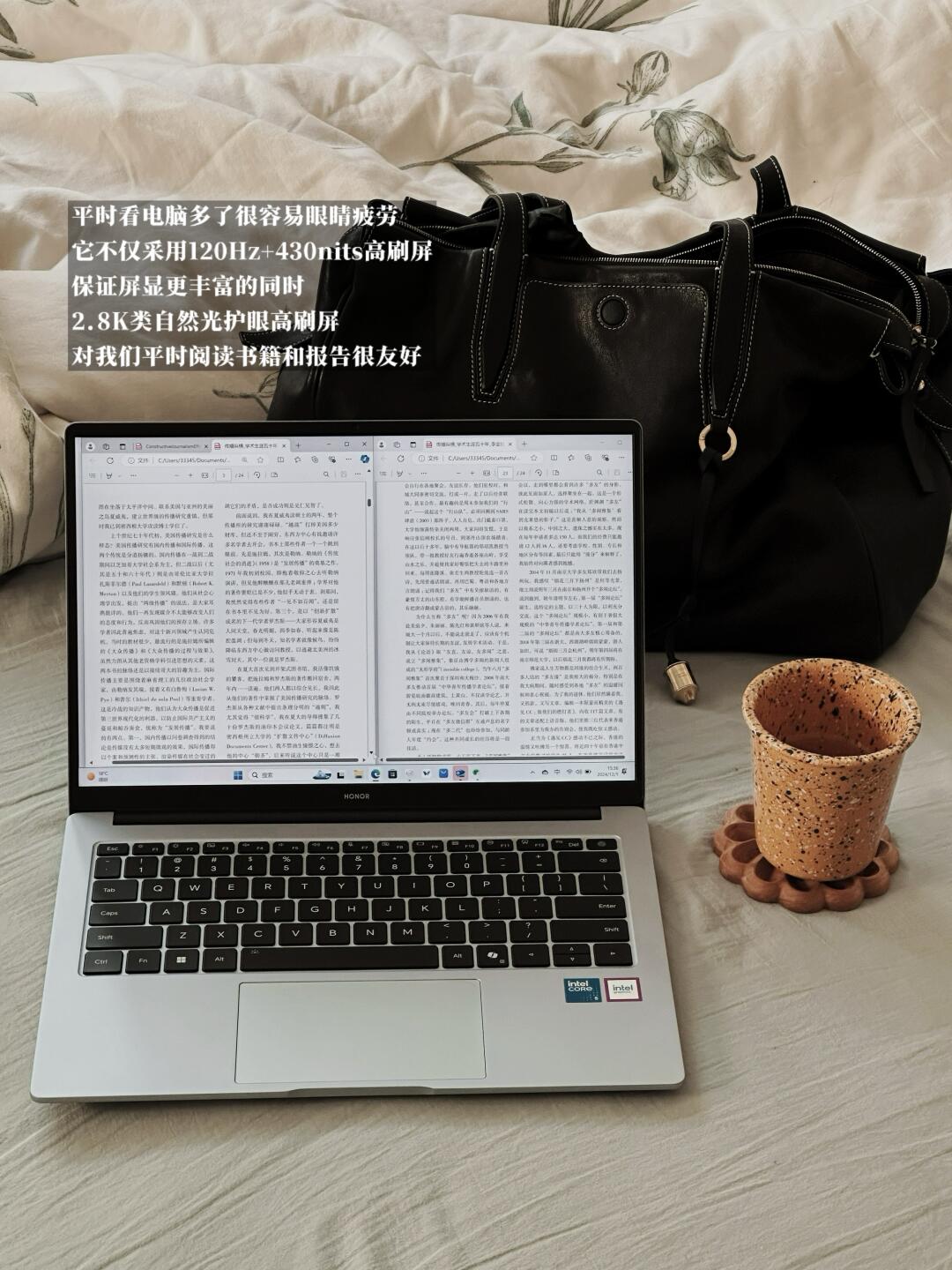 ②这两年看书多眼容易疲劳,荣耀这款轻薄本在采用120Hz+430nits屏幕高刷保证屏显更丰富同时,2.8K类自然光护眼高刷屏和德国莱茵TUV双重护眼认证,多重护眼🍂
