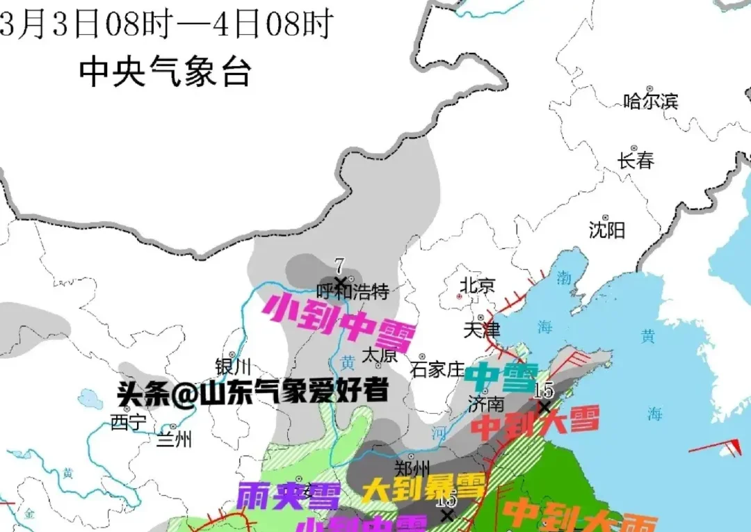 预计强降水范围偏向东南部,鲁南、鲁中大部和半岛地区降水(雪)量在3毫米以上,鲁东南、半岛南部地区可达到10~20毫米。如果上述地区全部换算成降雪量级的话,这将是大雪(10毫米)以上[暗中观察R]