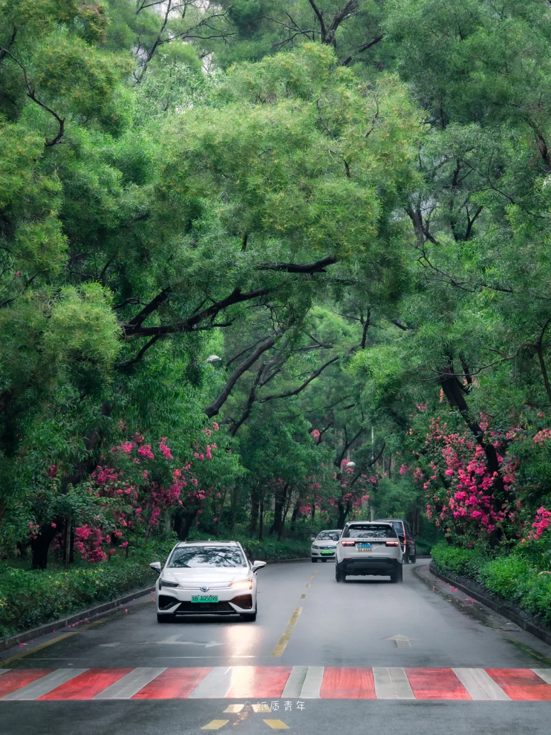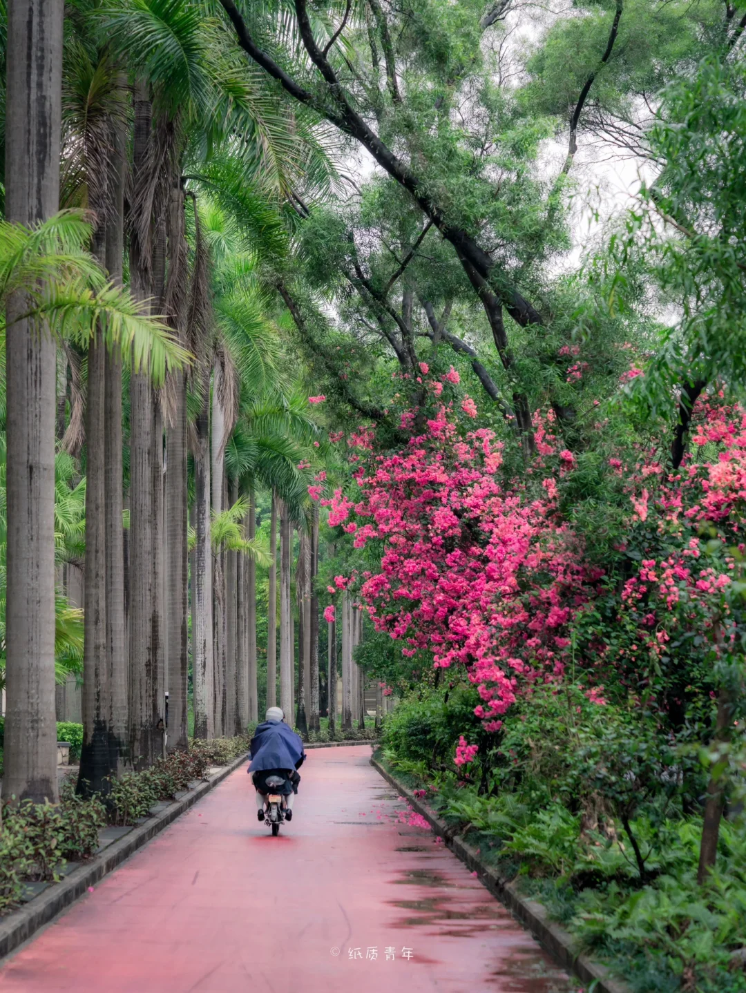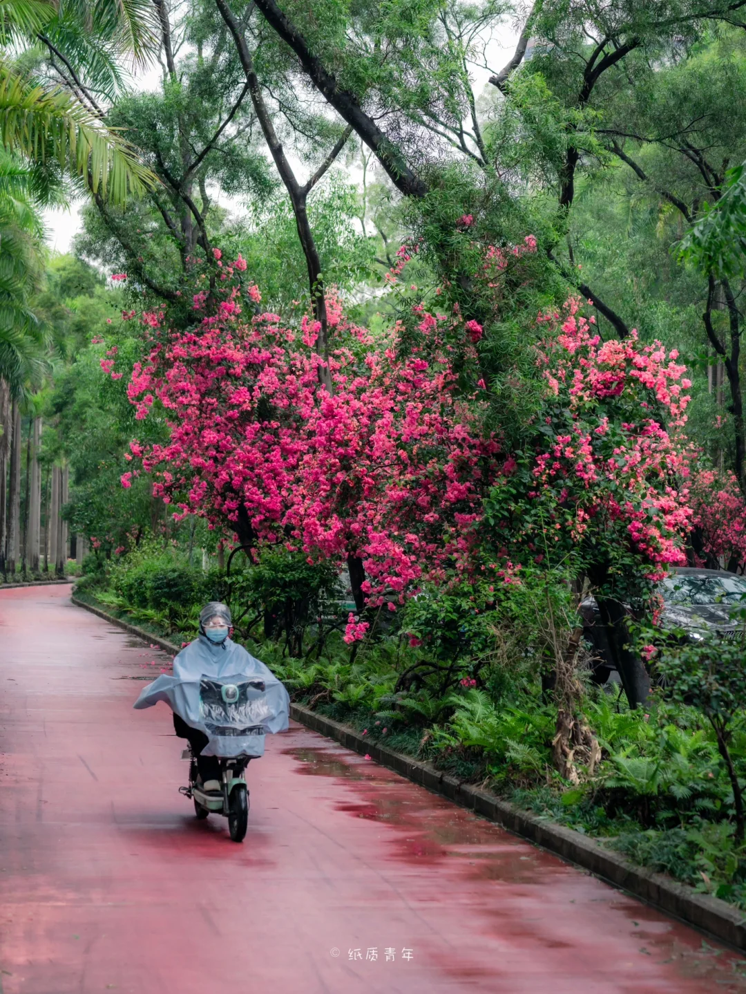 ❷雨后的树林显得特别通透干净,一排排的三角梅在万绿丛中十分显眼🌸,对比色的冲击非常特别。