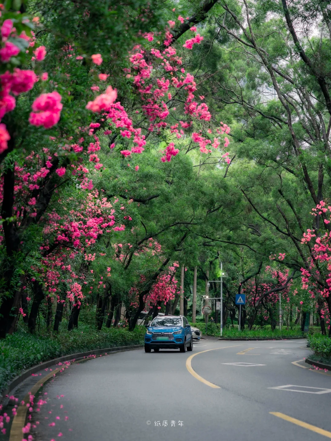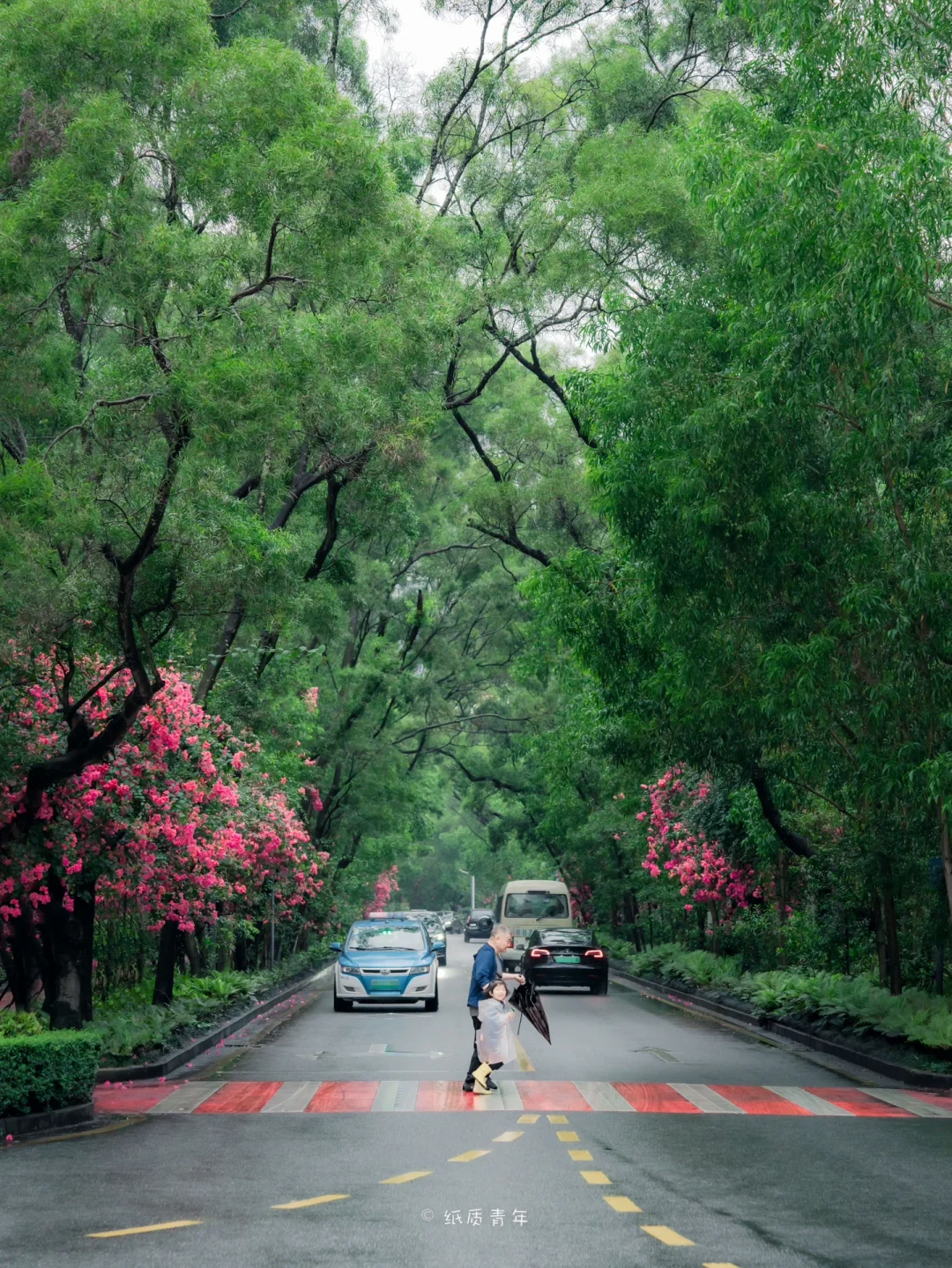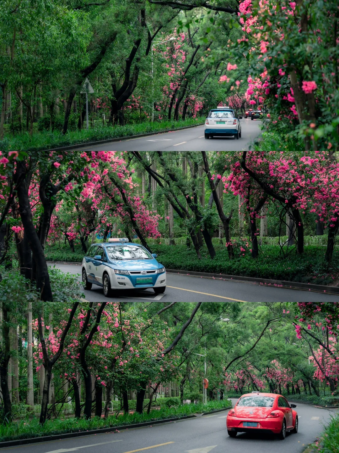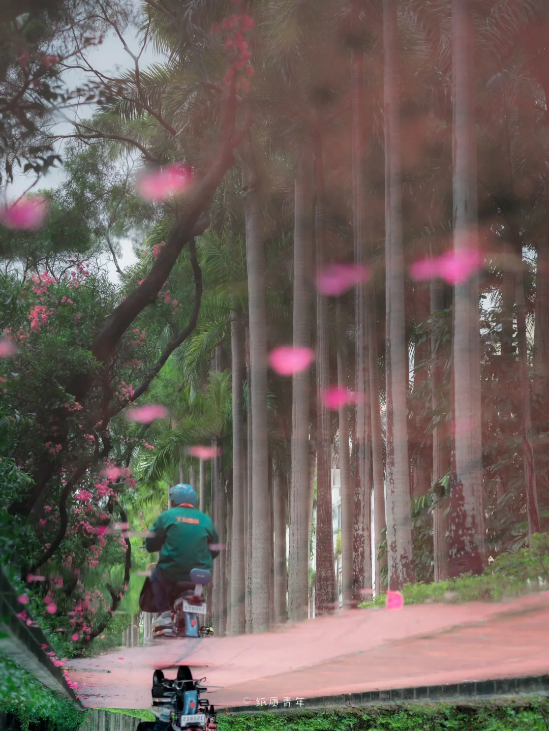 ❷雨后的树林显得特别通透干净,一排排的三角梅在万绿丛中十分显眼🌸,对比色的冲击非常特别。