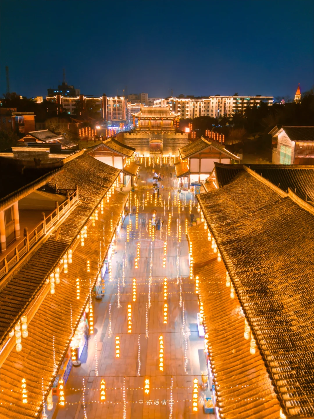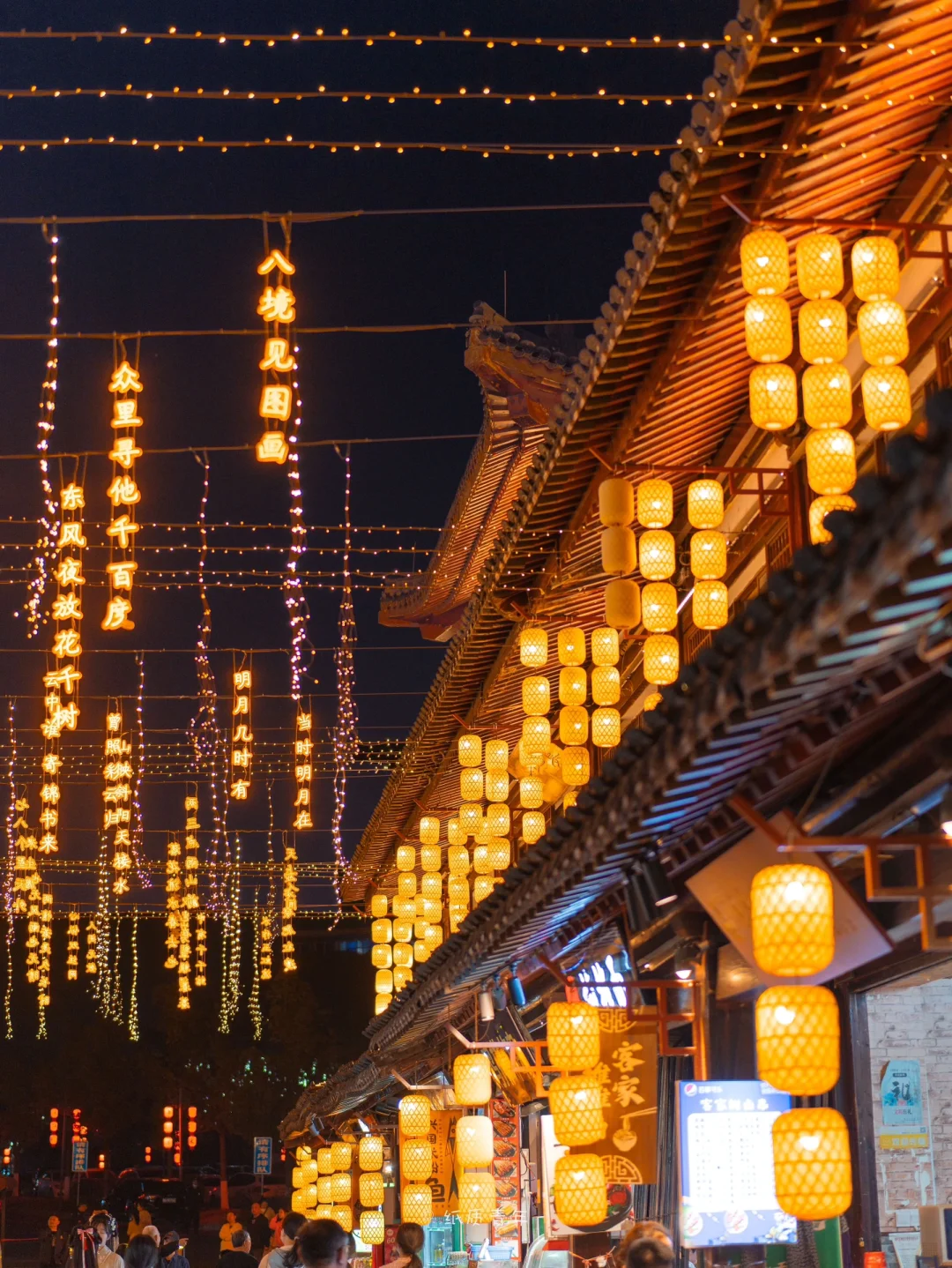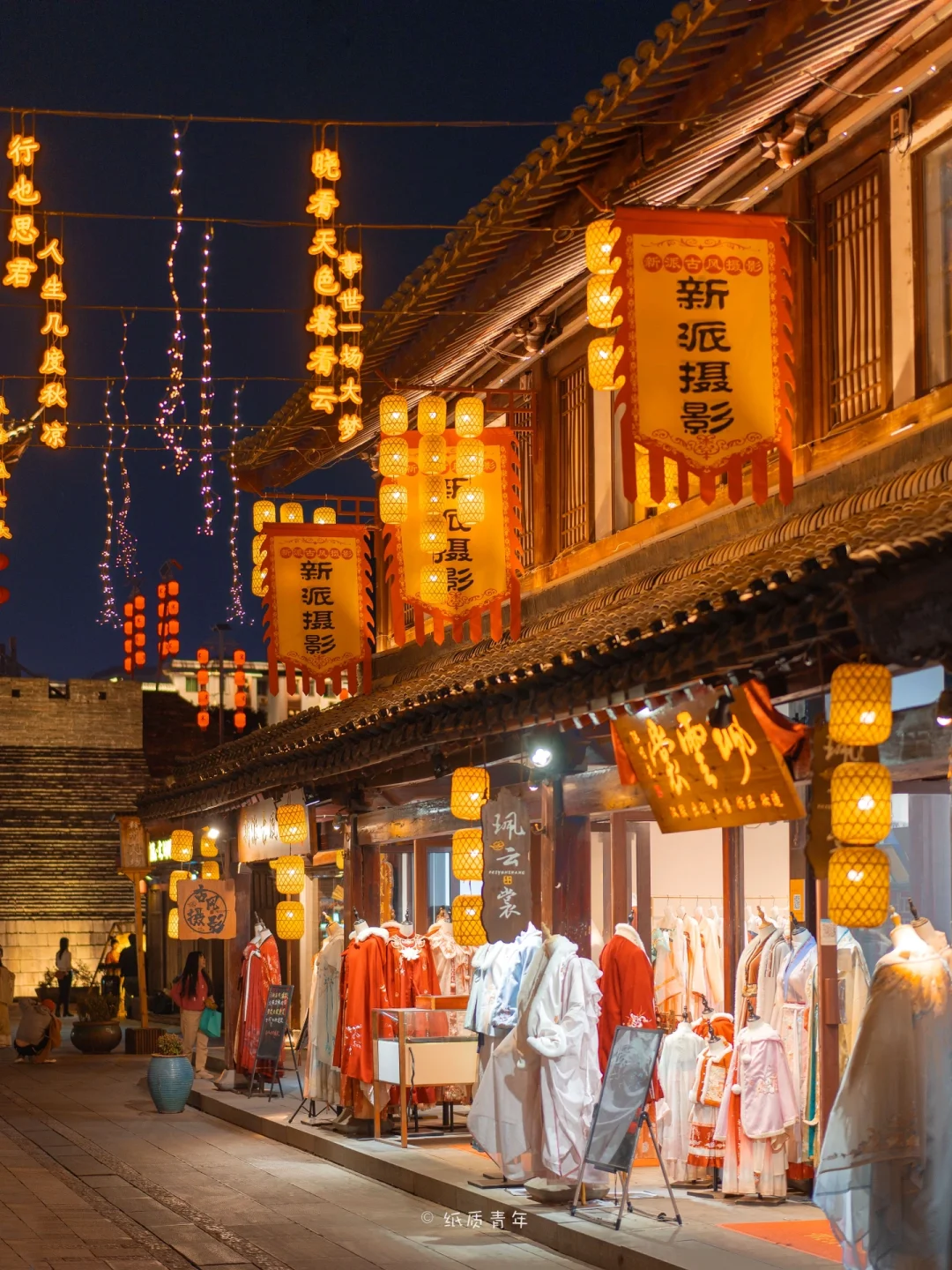 ❷从军门楼进去就能看到挂满整条街巷的古诗词,两旁的古城古建筑灯火阑珊,穿上汉服仿佛穿越到了宋朝。