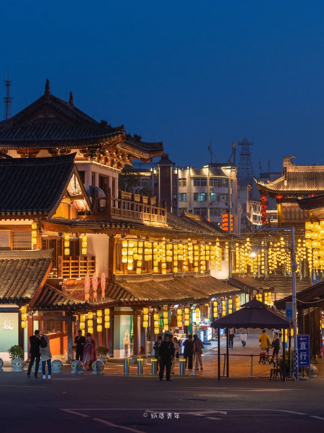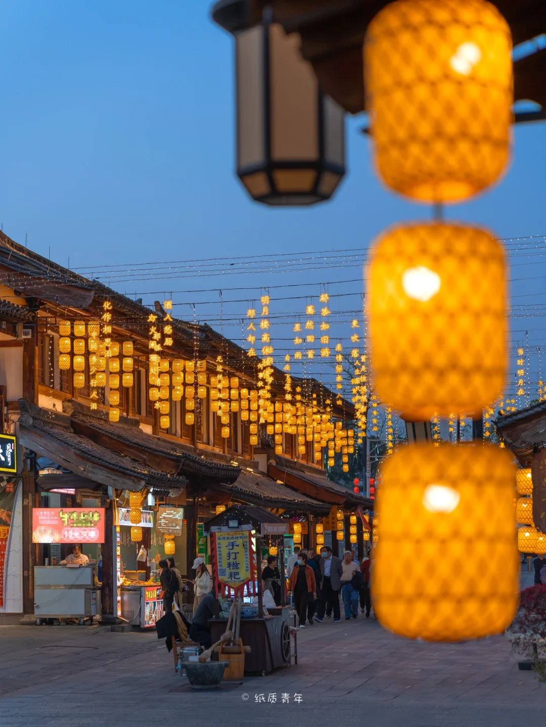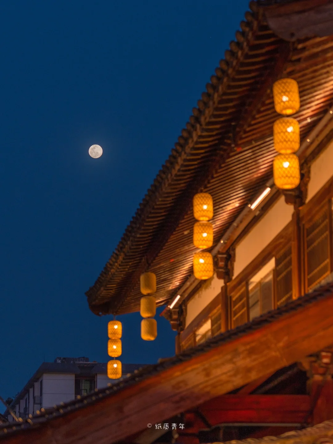 ❷从军门楼进去就能看到挂满整条街巷的古诗词,两旁的古城古建筑灯火阑珊,穿上汉服仿佛穿越到了宋朝。