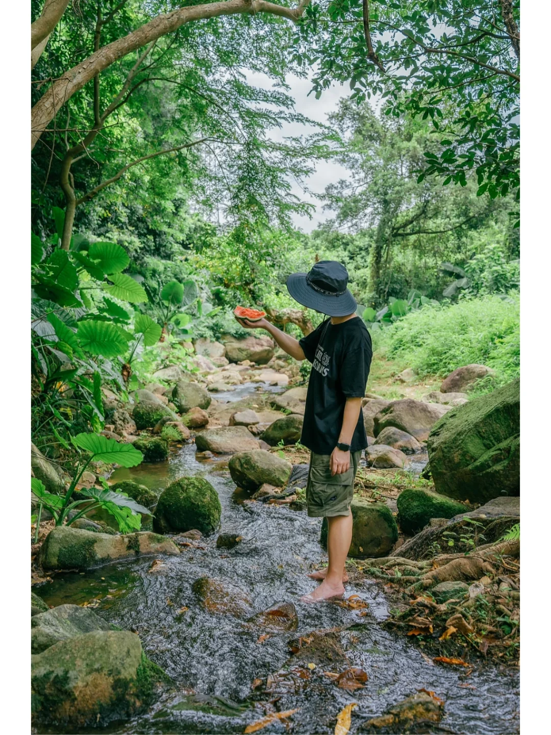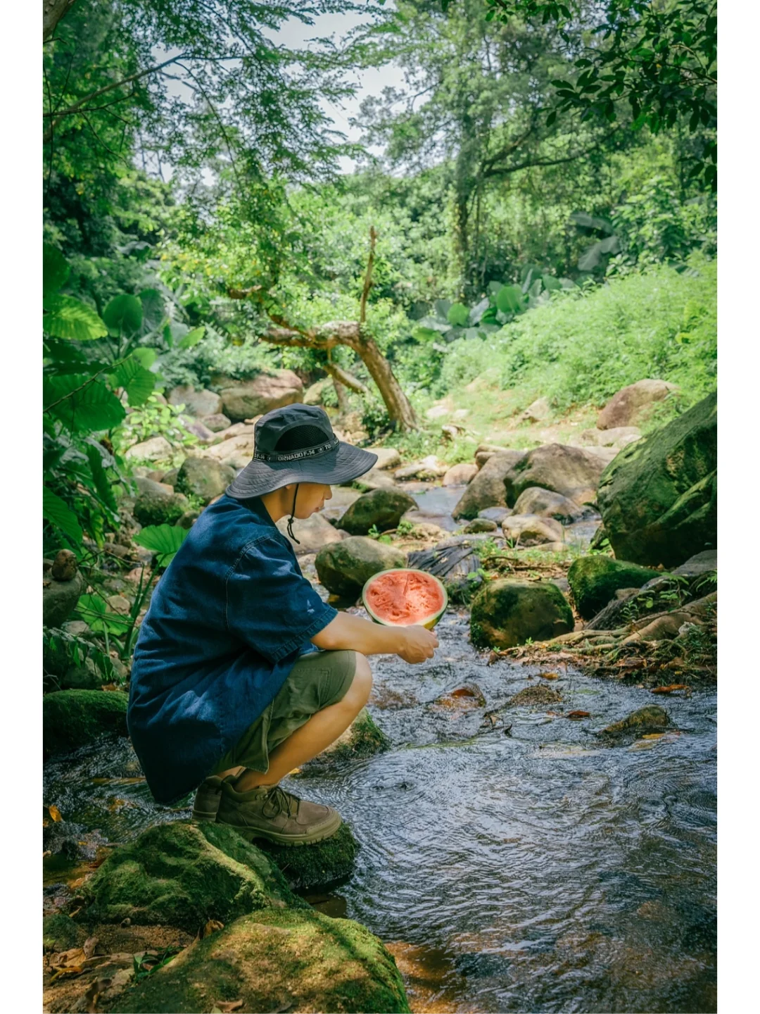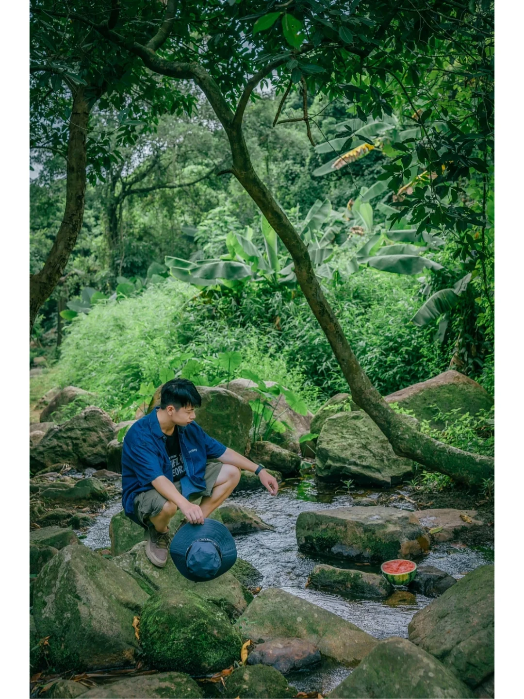 2️⃣小溪比较长,我选择的是下游,石头较少比较好拍照,也可以根据自身情况选择一块戏水处进行野餐露营拍照。