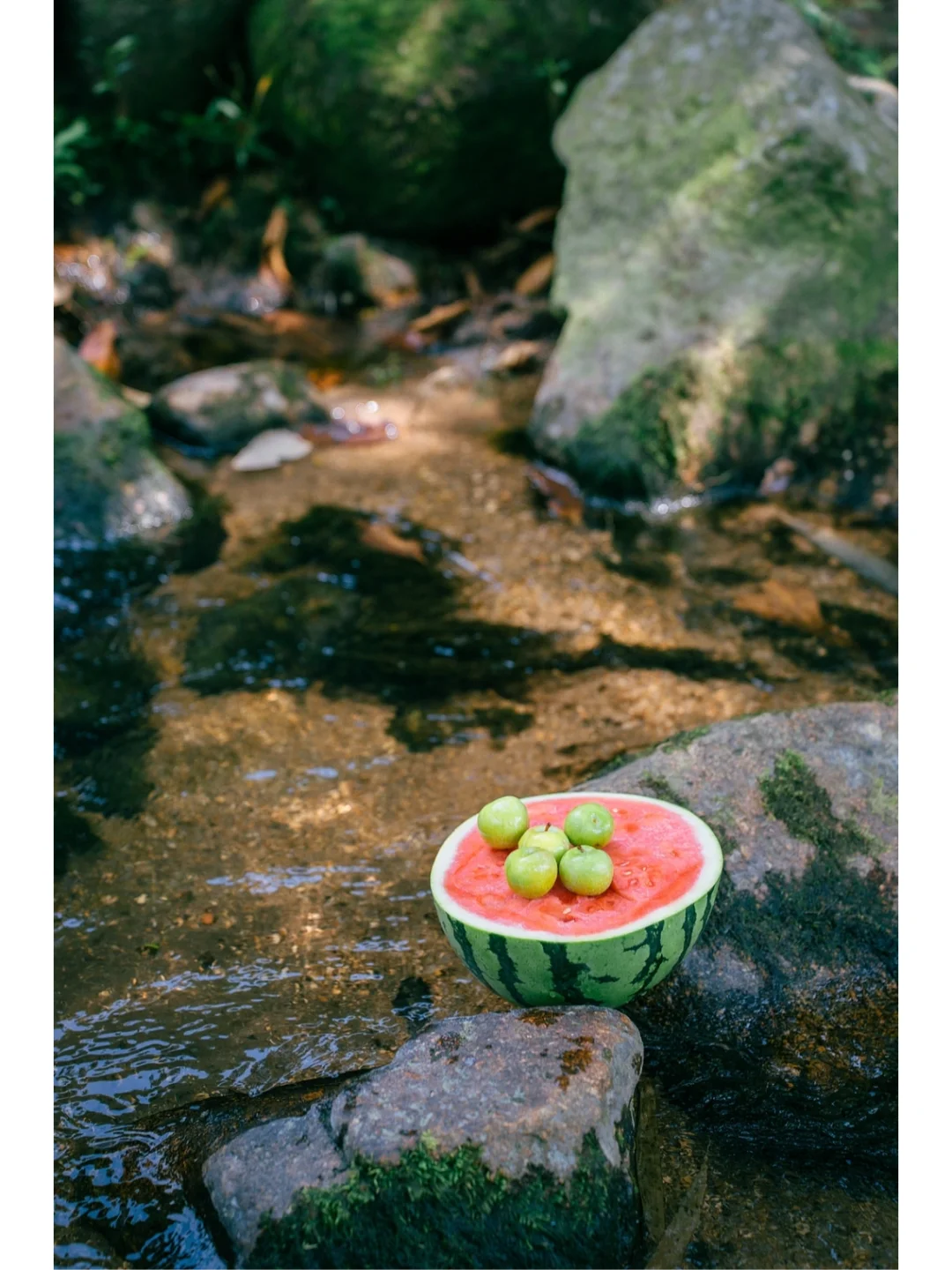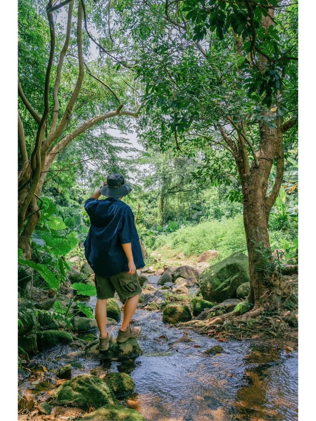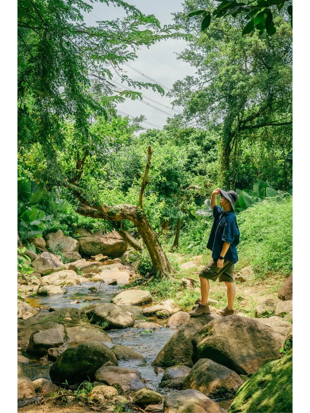 2️⃣小溪比较长,我选择的是下游,石头较少比较好拍照,也可以根据自身情况选择一块戏水处进行野餐露营拍照。