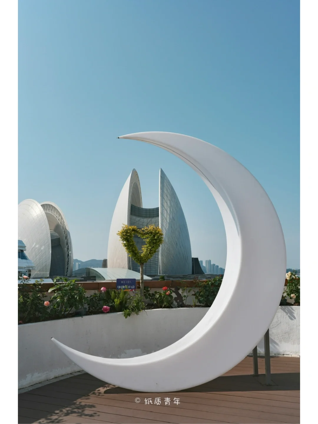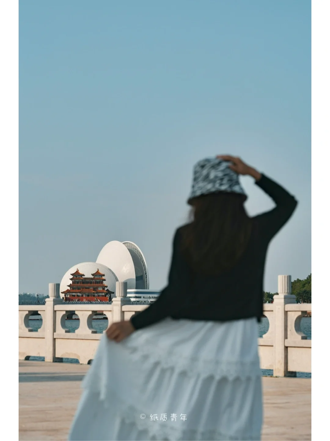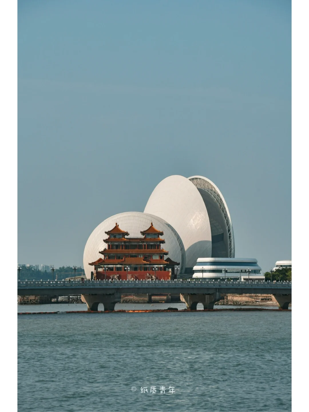 4️⃣时间充足的话可以到旁边的野狸岛公园逛一逛,然后去情侣路打卡必打卡的月舫和日月贝的重合机位,古楼与现代建筑完美结合,毫无违和感。