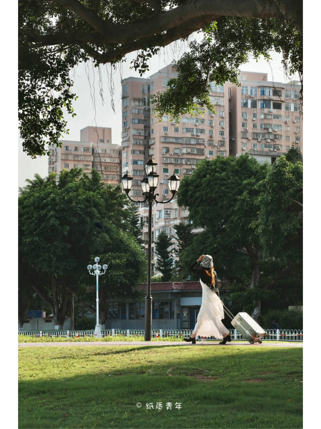 2️⃣拍摄的时候选择顺光拍摄拉着行李箱的背影,逆光拍摄可以拍侧脸,可以拍出人虚景实的氛围感。